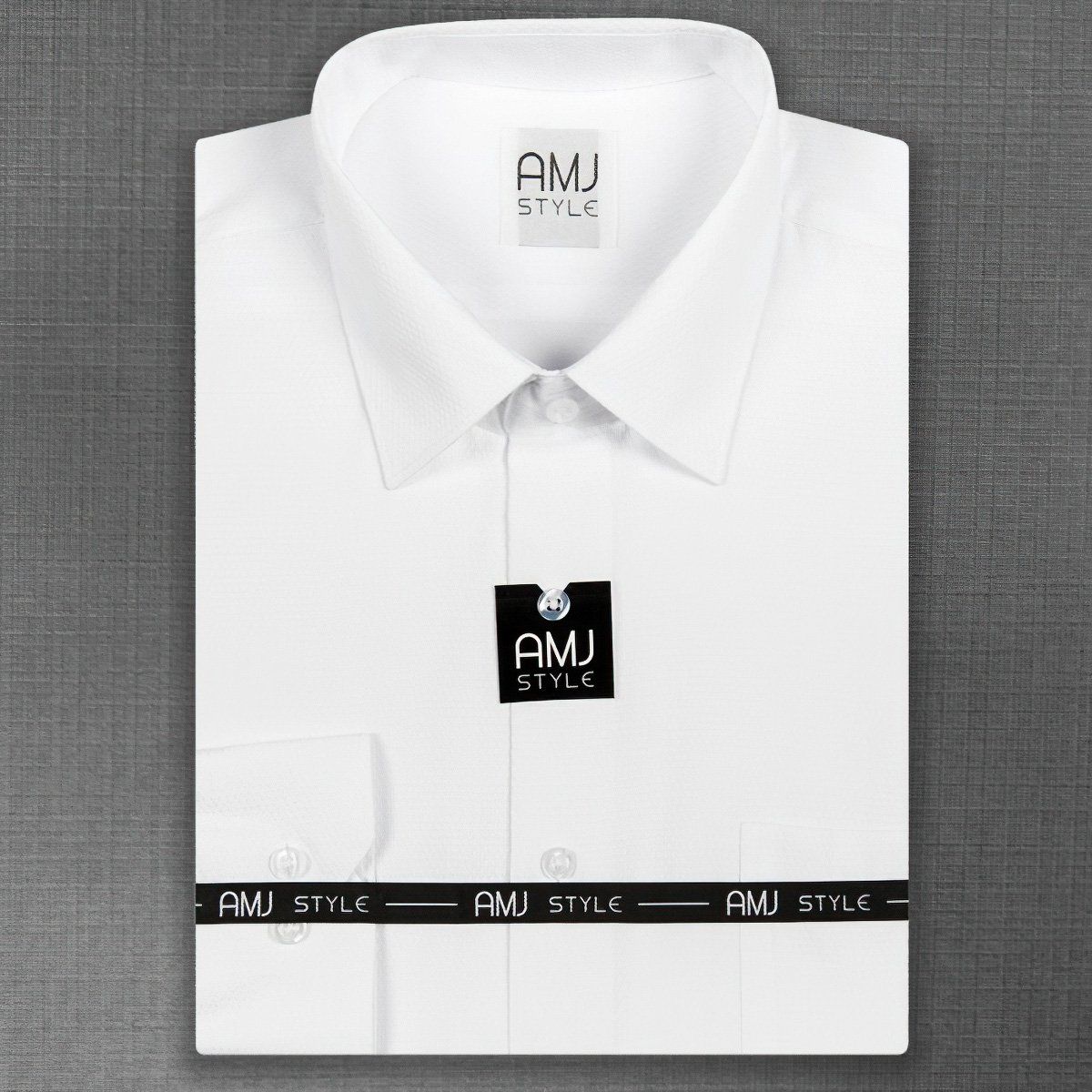 Pánská jednobarevná bílá košile AMJ Style s dlouhým rukávem v prodlouženém rozměru s vetkávaným vzorem v projmutém (slim...