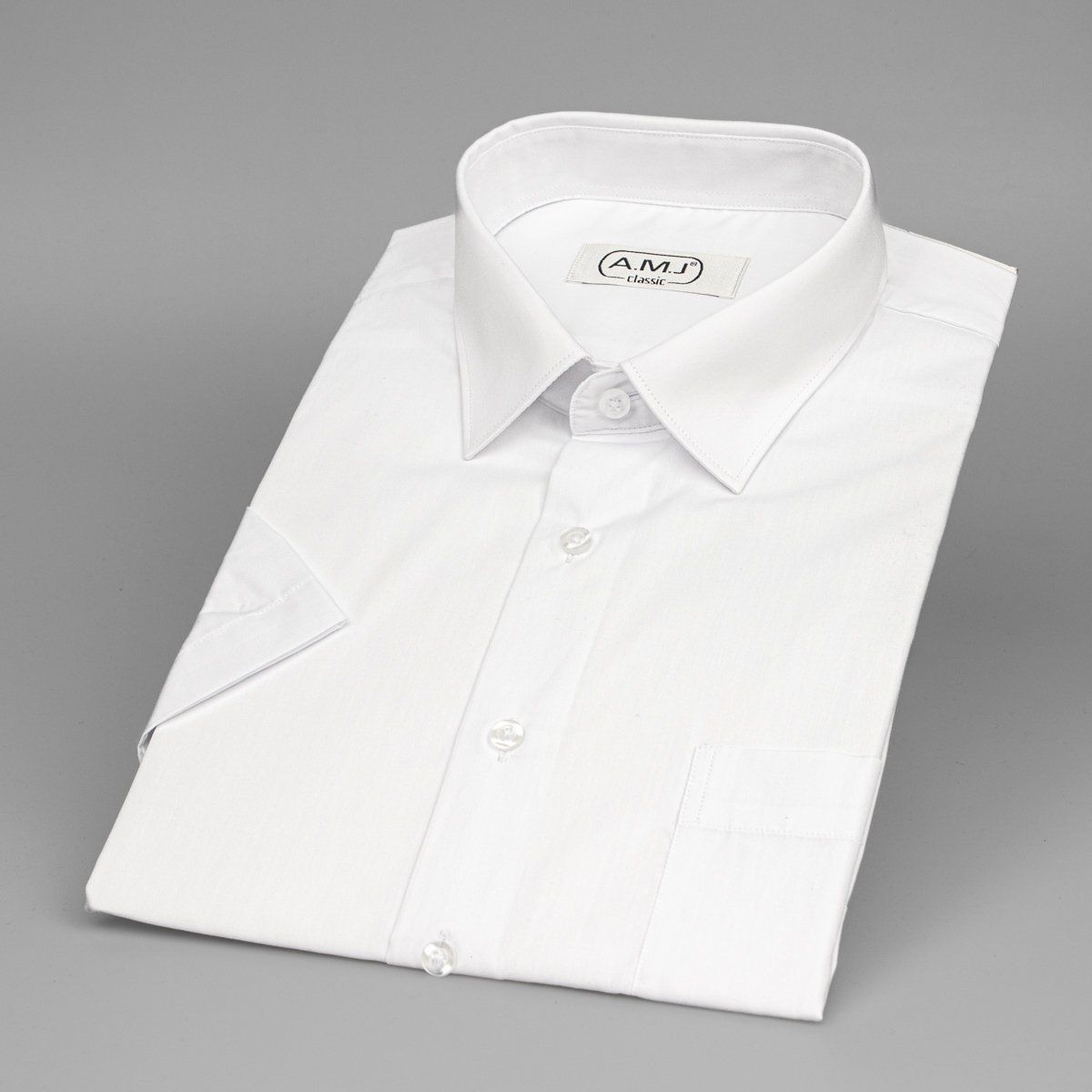 Pánská jednobarevná bílá košile AMJ Classic s krátkým rukávem v prodlouženém rozměru.