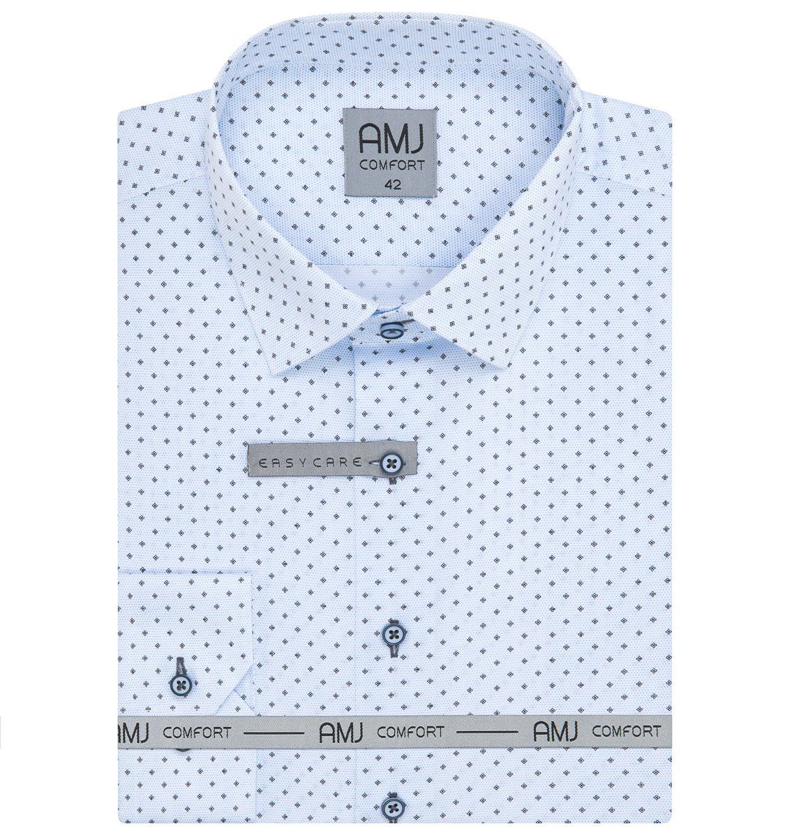 Pánská vzorovaná košile AMJ Comfort s dlouhým rukávem. Pánská košile je v modré barvě s černými kytičkami. Košile se hodí jak do zaměstnání, tak na běžné nošení i do společnosti. V této košili Vám bude příjemně díky použití kvalitního inovovaného materiálu 68% lyocelu, 28% polyesteru a 4% elastanu. Lyocell (nebo-li tencel) je velmi savé přírodní vlákno, které saje až o 50% tekutiny více než bavlna a přitom zachová na pokožce pocit sucha, je nemačkavé a chladivé v létě, hřejivé v zimě.