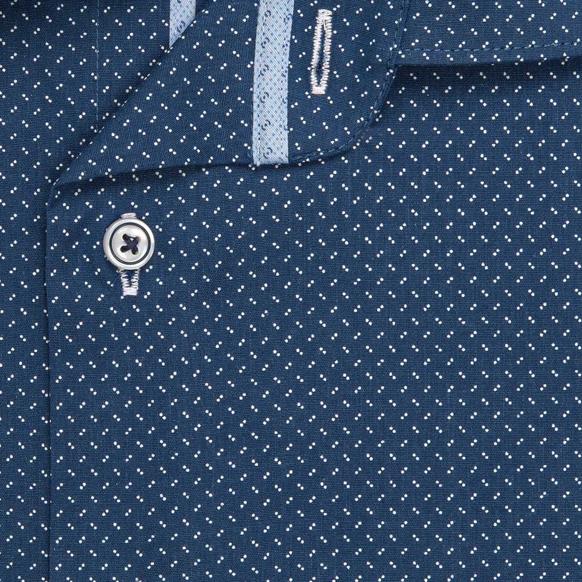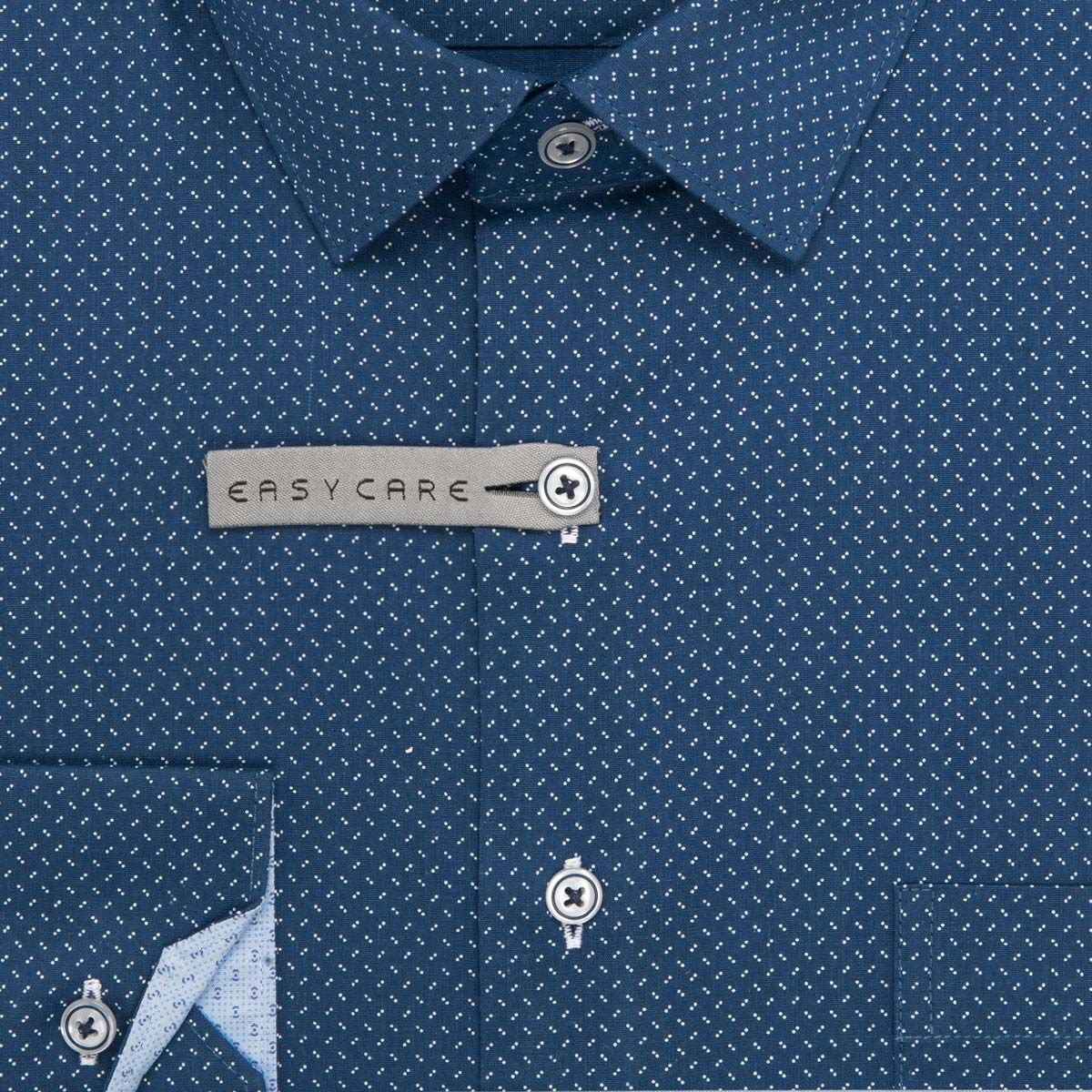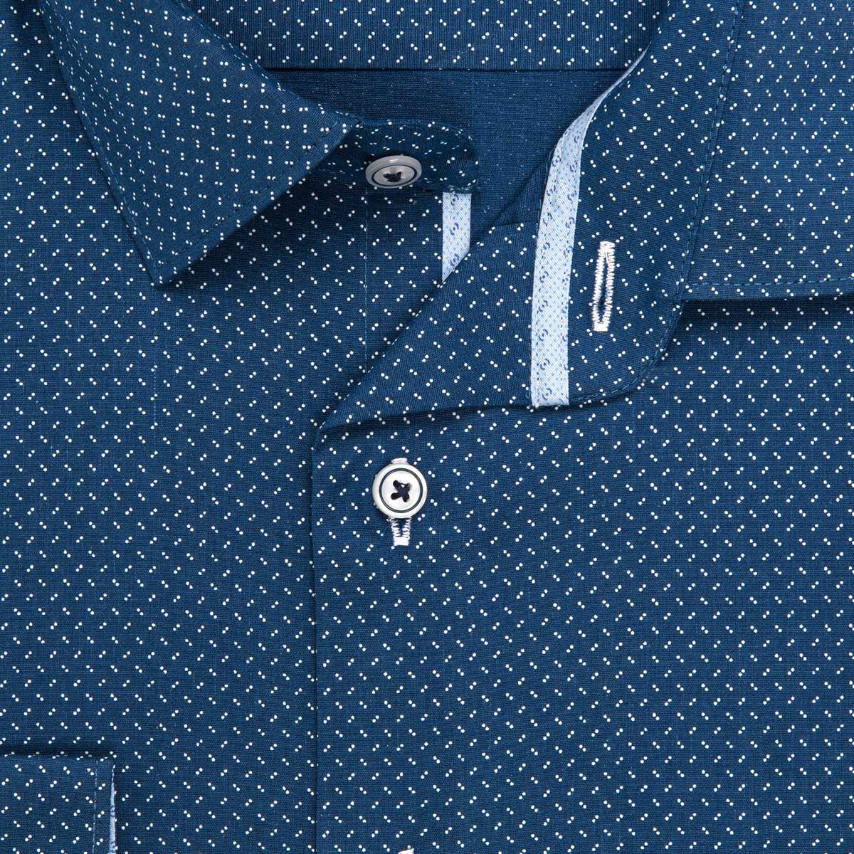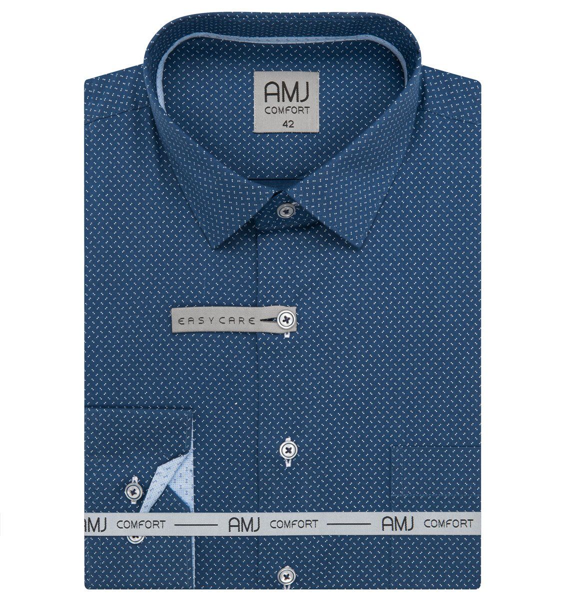 Pánská vzorovaná košile AMJ Comfort s dlouhým rukávem. Pánská košile je v modré barvě se vzorem bílých dvojteček a světl...
