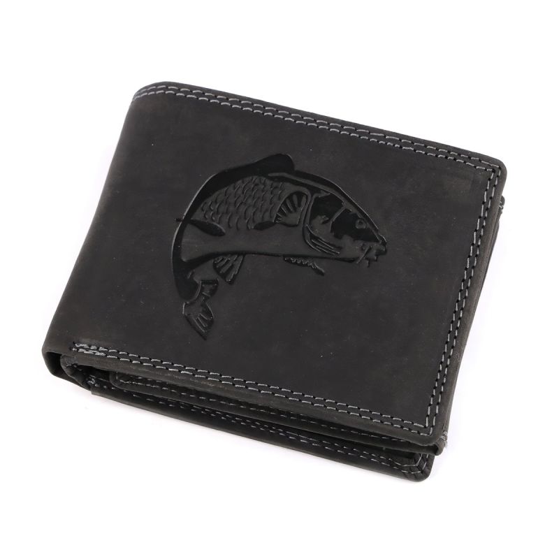 Pánská kožená rybářská peněženka s RFID ochranou, 870349/22, černá - ryba, matná, 9,5 x 15 x 3,5 cm