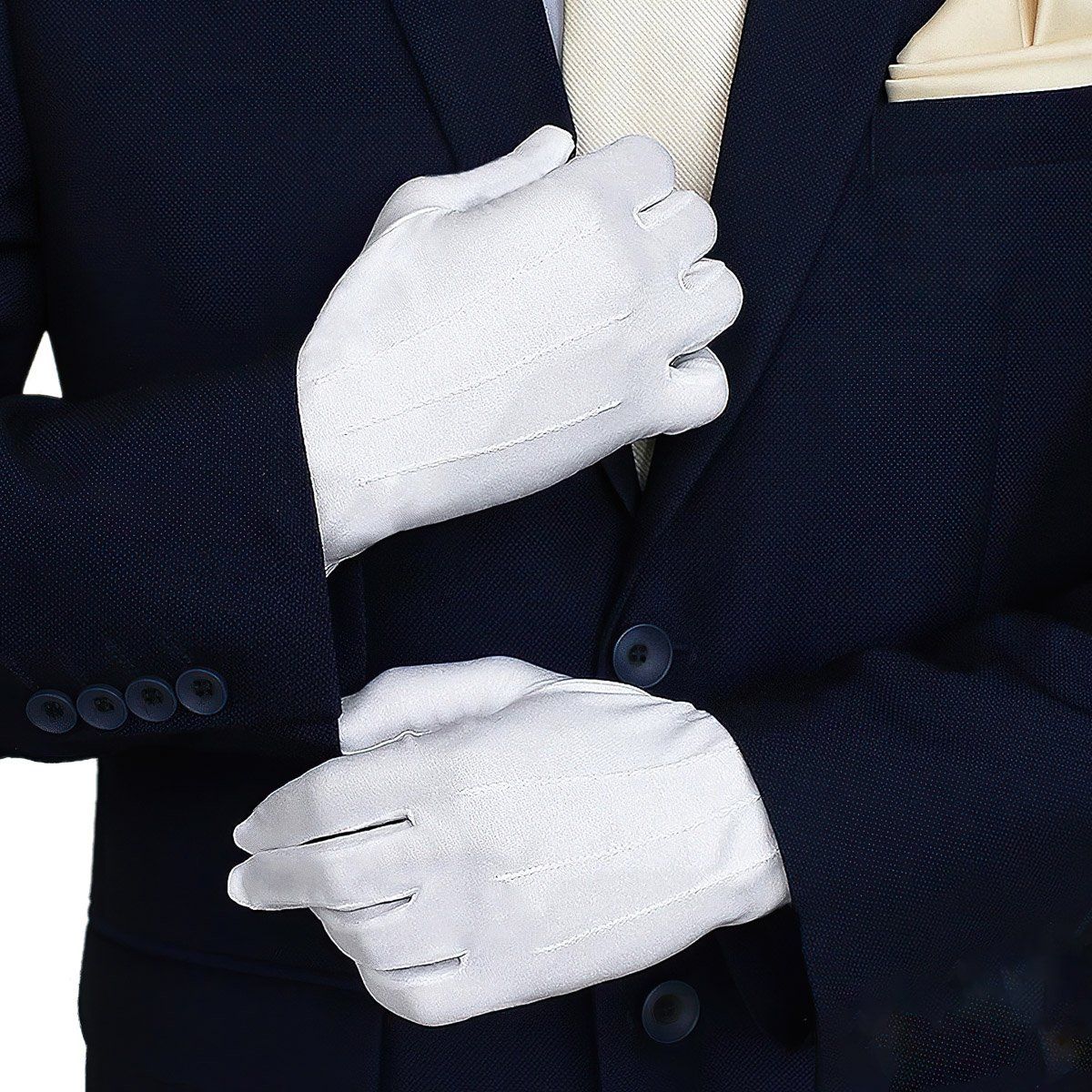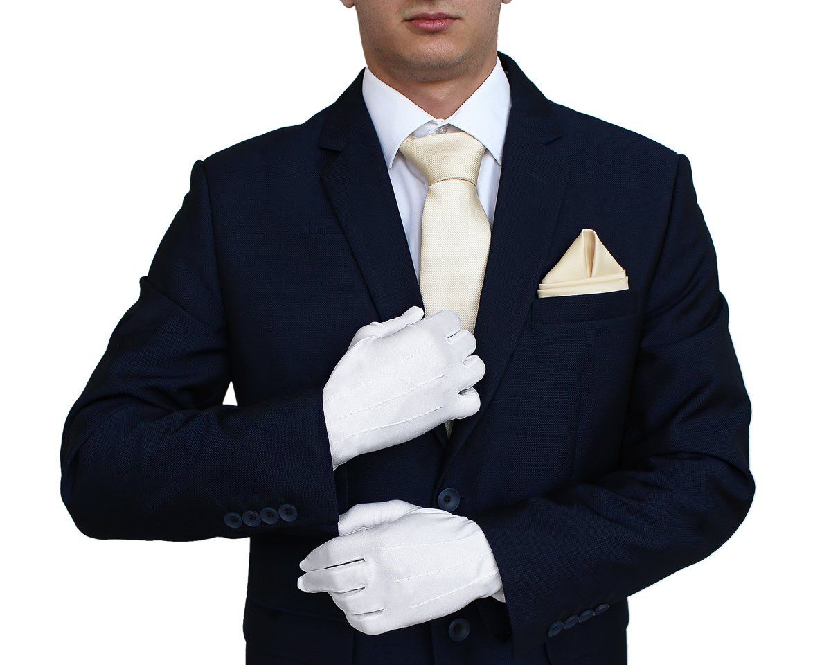 Pánské saténové společenské rukavice v jednobarevné bílé barvě s luxusním vzhledem a vysokou kvalitou zpracování. Svým zpracováním jsou rukavice velmi jemné, příjemné a hladké. Rukavičky lze využít jak v tanečních, tak na svatbě, na plese nebo na jakékoliv společenské události. Tyto společenské pánské rukavičky jsou široké 9 cm a dlouhé 25,5 cm (volně položené). Složení rukavic je kombinace polyesteru a elastanu.