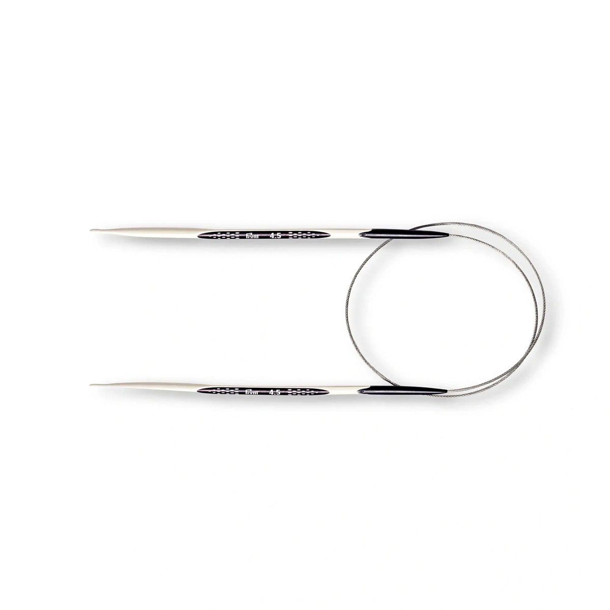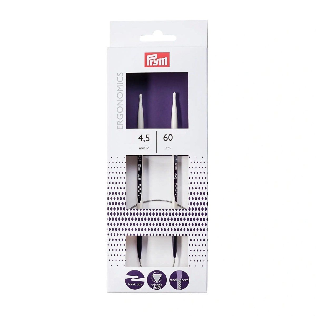 Revoluční pletací jehlice z vysoce funkčního syntetického materiálu německé firmy PRYM. Jehlice jsou ergonomické, velmi lehké a nehlučné. Špička ve tvaru kapky umožňuje jednodušší zachycení příze a hladké vedení jednotlivých ok, které je podpořeno i trojúhelníkovým profilem jehlice. Kruhové jehlice jsou spojeny ocelovým lankem potaženým plastem v délce 60cm a velikosti 4,5mm, které je pevné, ale zároveň i jemné a poddajné. Balení obsahuje 1 kus jehlic.