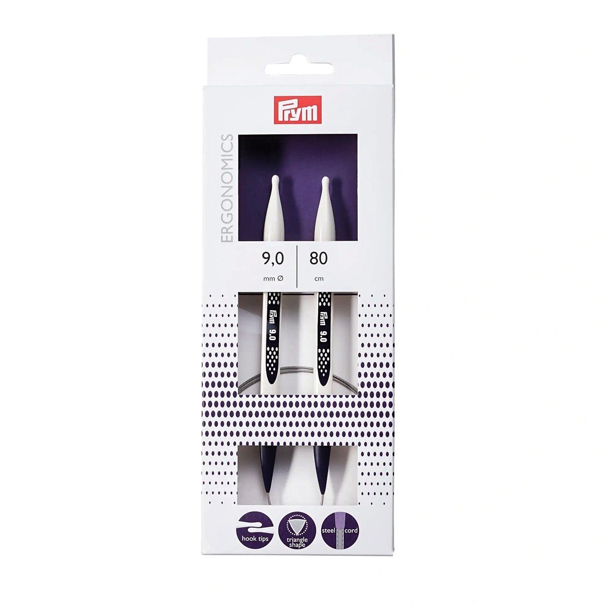Revoluční pletací jehlice z vysoce funkčního syntetického materiálu německé firmy PRYM. Jehlice jsou ergonomické, velmi lehké a nehlučné. Špička ve tvaru kapky umožňuje jednodušší zachycení příze a hladké vedení jednotlivých ok, které je podpořeno i trojúhelníkovým profilem jehlice. Kruhové jehlice jsou spojeny ocelovým lankem potaženým plastem v délce 80cm a velikosti 9mm, které je pevné, ale zároveň i jemné a poddajné. Balení obsahuje 1 kus jehlic.