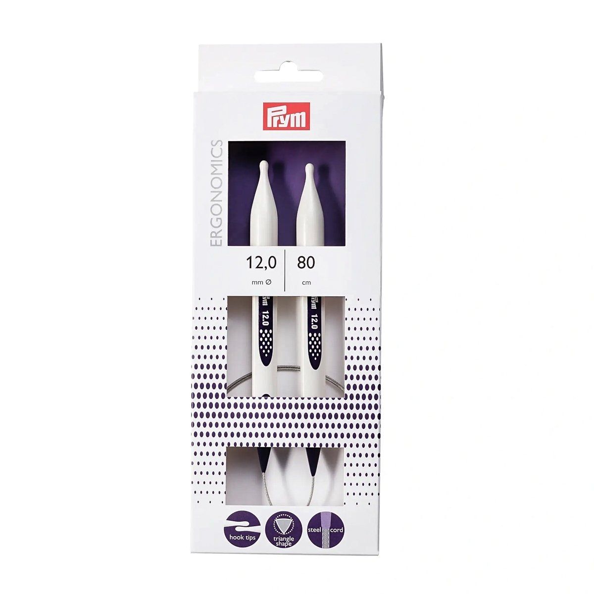 Revoluční pletací jehlice z vysoce funkčního syntetického materiálu německé firmy PRYM. Jehlice jsou ergonomické, velmi lehké a nehlučné. Špička ve tvaru kapky umožňuje jednodušší zachycení příze a hladké vedení jednotlivých ok, které je podpořeno i trojúhelníkovým profilem jehlice. Kruhové jehlice jsou spojeny ocelovým lankem potaženým plastem v délce 80cm a velikosti 12mm, které je pevné, ale zároveň i jemné a poddajné. Balení obsahuje 1 kus jehlic.