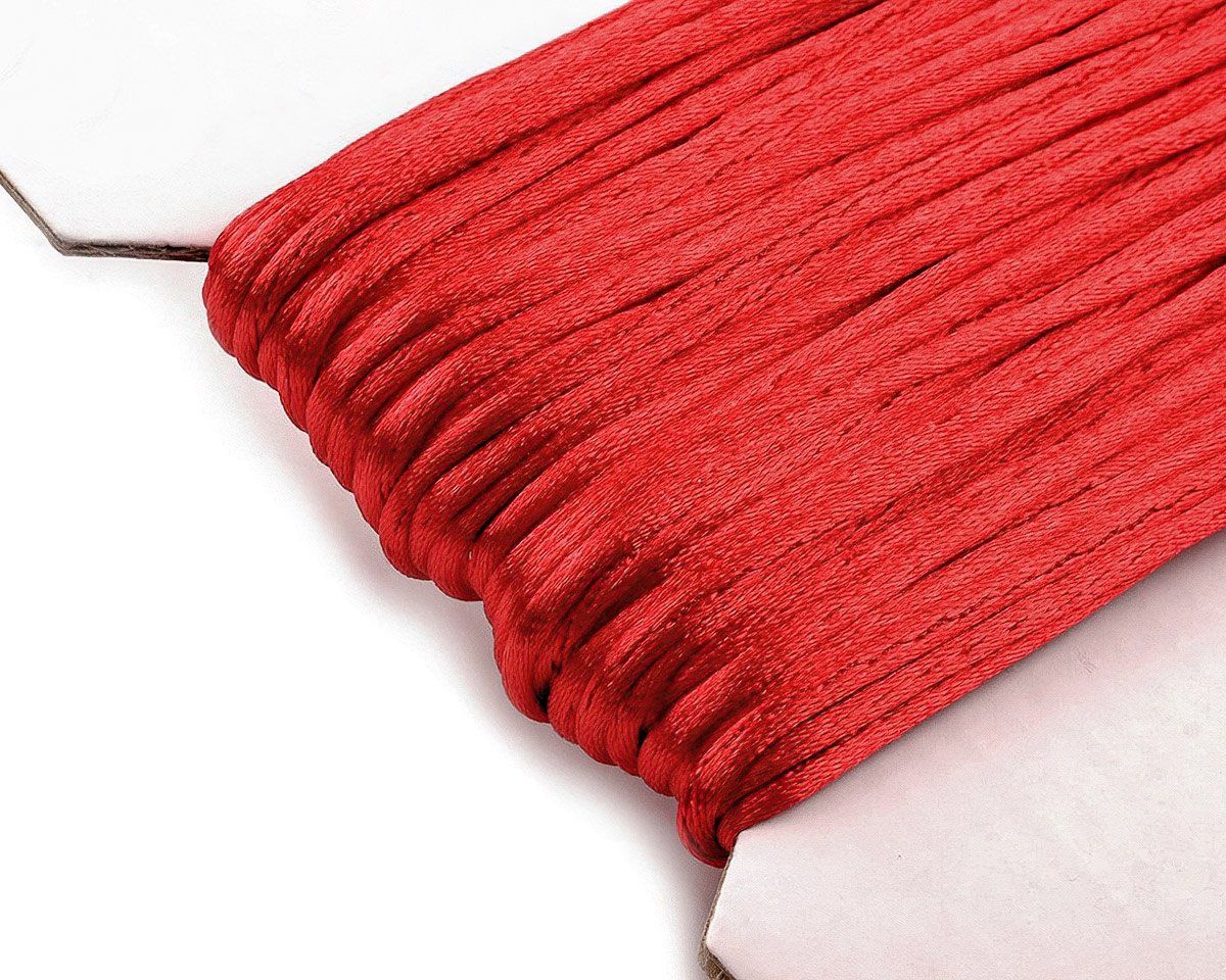 Pletací / háčkovací či drhací saténová příze (100% Polyester) v jednobarevné červené barvě je cca 2 mm silná. Příze je určená pro techniku drhání, navlékání, kumihimo, ale také nestrukturované, lesklé háčkované či pletené kabelky a další dekorační výrobky. Tyto saténové příze jsou velice kvalitní, netrhají se, rychle se neprodřou a jsou stálobarevné.