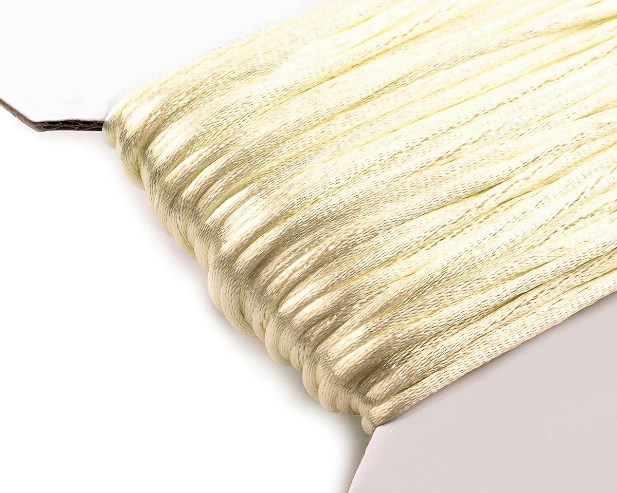 Pletací / háčkovací či drhací saténová příze (100% Polyester) v jednobarevné světle krémové barvě je cca 2 mm silná. Příze je určená pro techniku drhání, navlékání, kumihimo, ale také nestrukturované, lesklé háčkované či pletené kabelky a další dekorační výrobky. Tyto saténové příze jsou velice kvalitní, netrhají se, rychle se neprodřou a jsou stálobarevné.