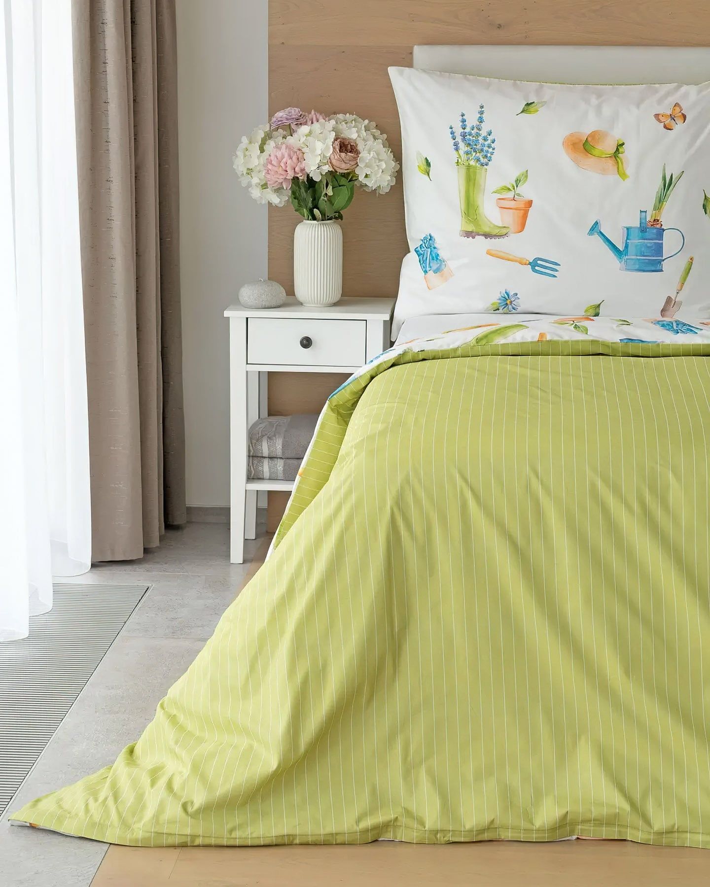Bavlněné povlečení se vzorem zahradnických potřeb na bílém podkladu. Povlak na přikrývku je oboustranný, z jedné strany má vzor na bílé, druhá strana je proužkovaná zelená. povlak na polštář má zahradnický vzor na bílé. Souprava je vyrobena ze 100% bavlny a obsahuje povlak na přikrývku 140 x 200 cm a povlak na polštář 70 x 90 cm. Zapínání na ZIP. Vzor je tištěn nejmodernějším digitálním tiskem, který zajišťuje vysoce precizní detail.Kvalitní ložní povlečení ze 100% bavlny bude skvělým doplňkem Vaší ložnice. Ověřená kvalita materiálu povlečení je zárukou dlouhé životnosti. Povlečení doporučujeme prát na 40°C tiskem dovnitř, při nastavení nižších otáček ždímání si také usnadníte žehlení s vyjímkou krepového povlečení, které se nežehlí. Vyberte si to pravé pro Vás!
