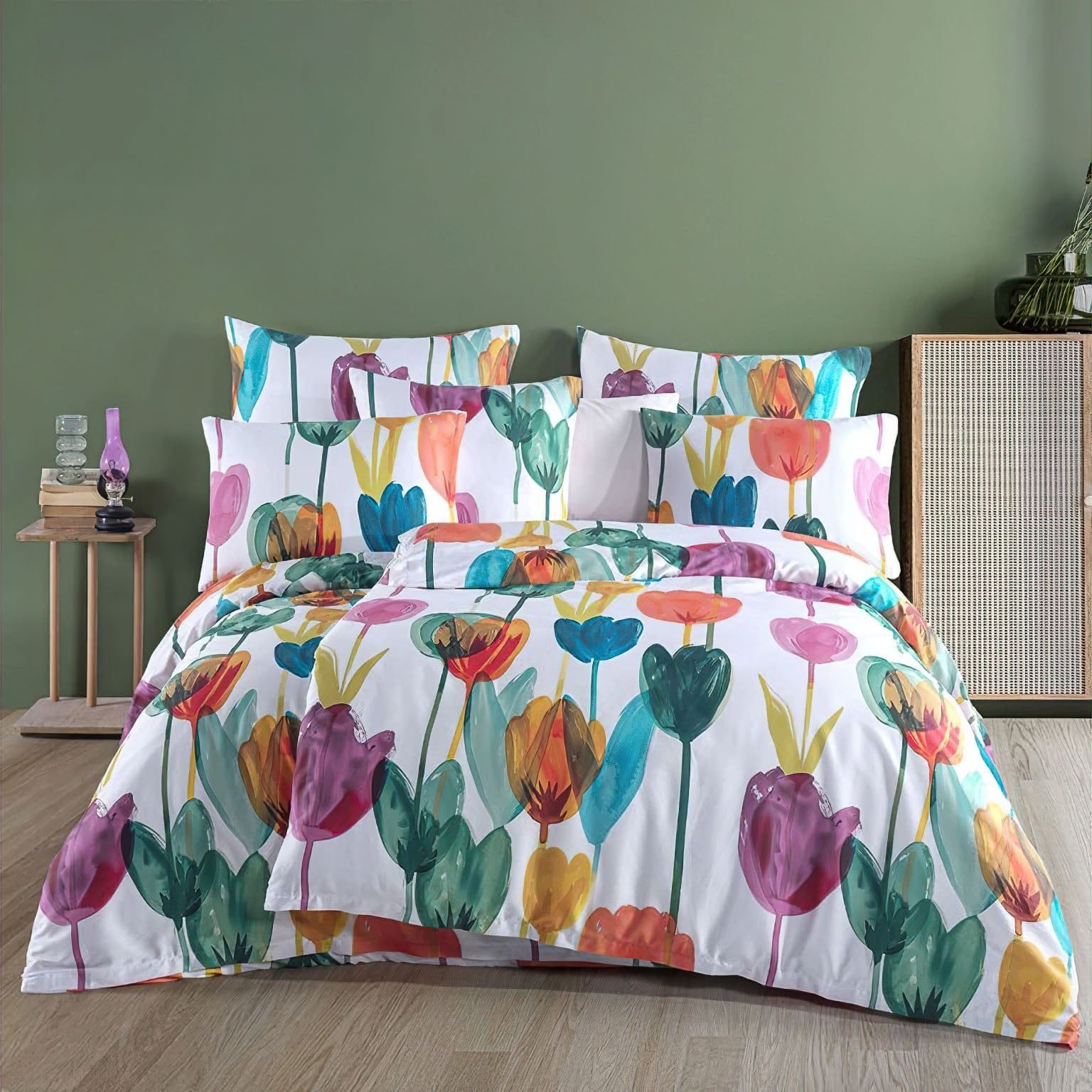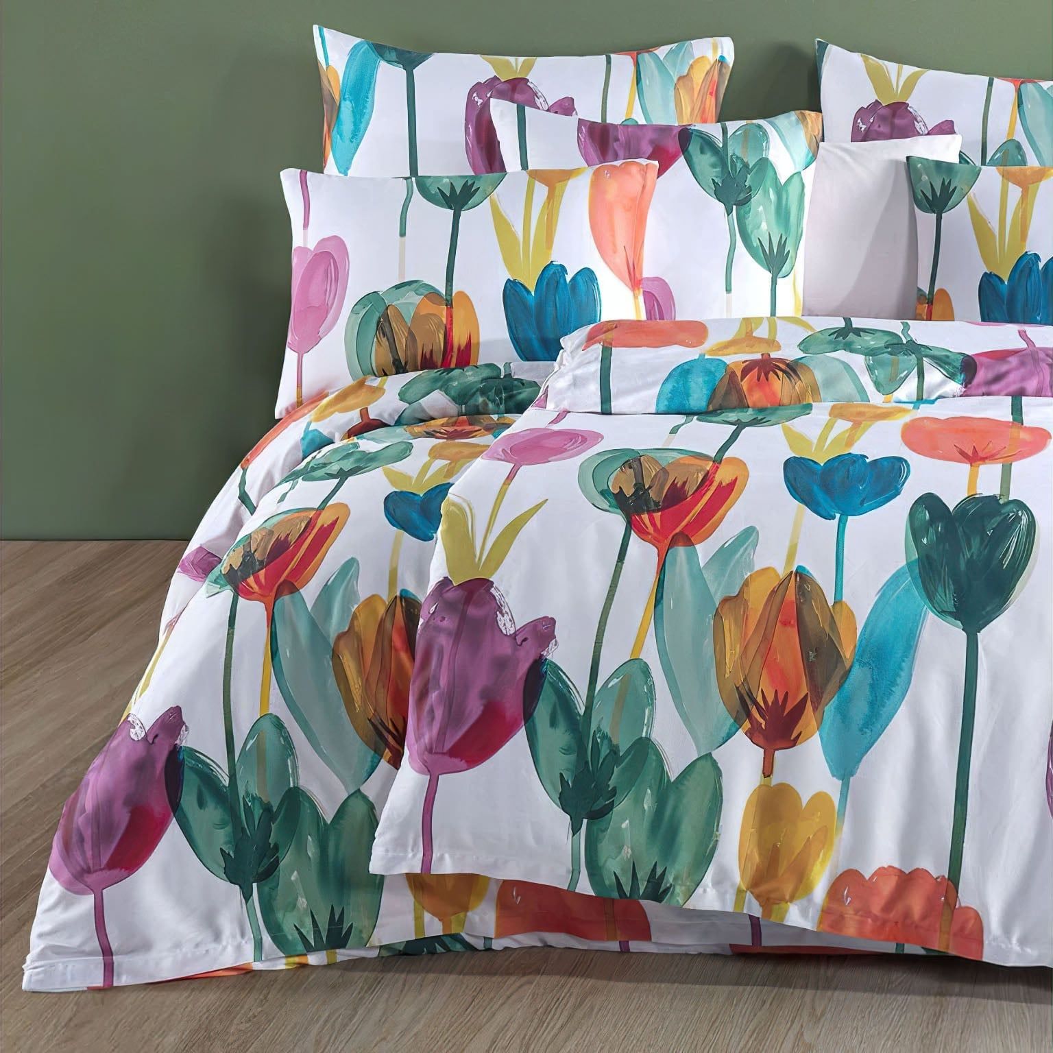 Povlečení TULIPI, barevné tulipány, bavlněný satén, 140x200cm + 70x90cm