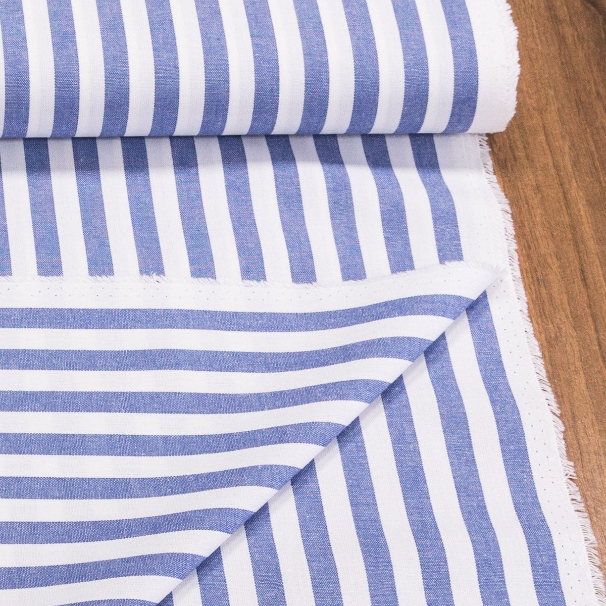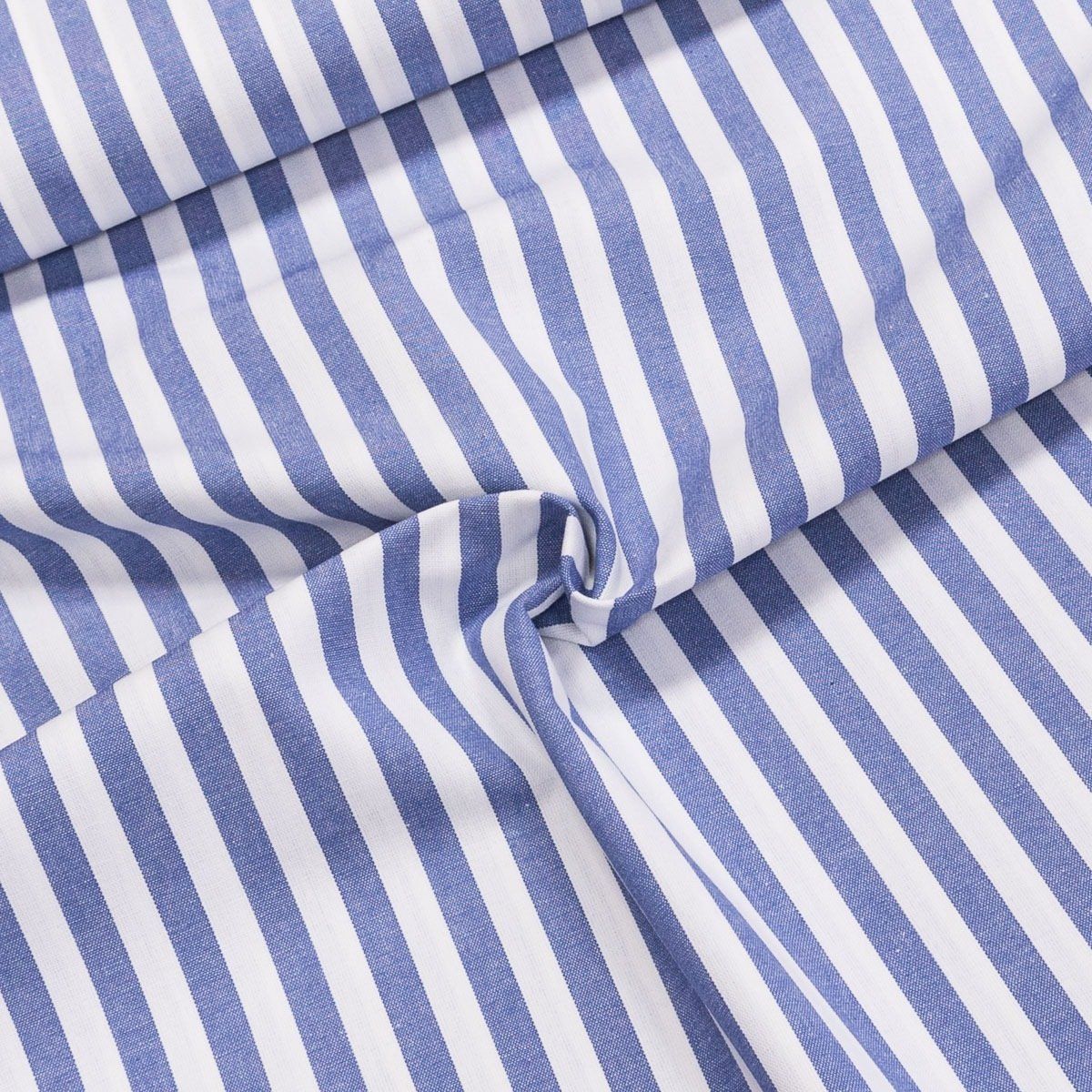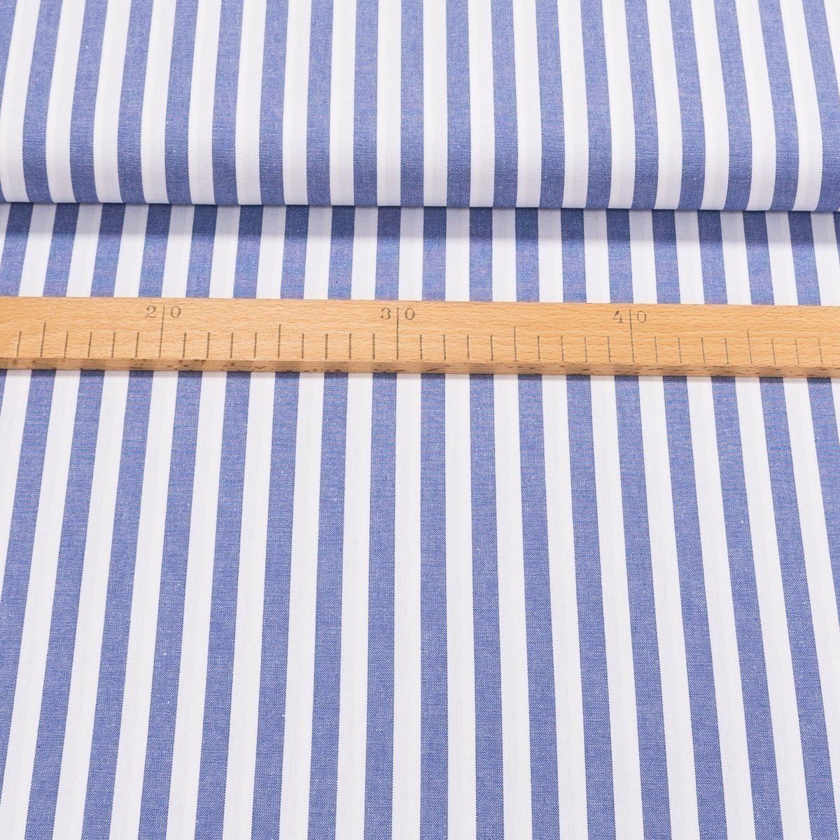 Bavlněný kanafas od českého výrobce proužkovaný, pestře tkaný (1 cm) v riflově modré barvě. Látka je v šířce 140 cm, vyrobena ze 100% bavlny (gramáž 177g/m2) v plátnové vazbě. Vzor látky je vytkávaný, a je tedy z obou stran stejný.