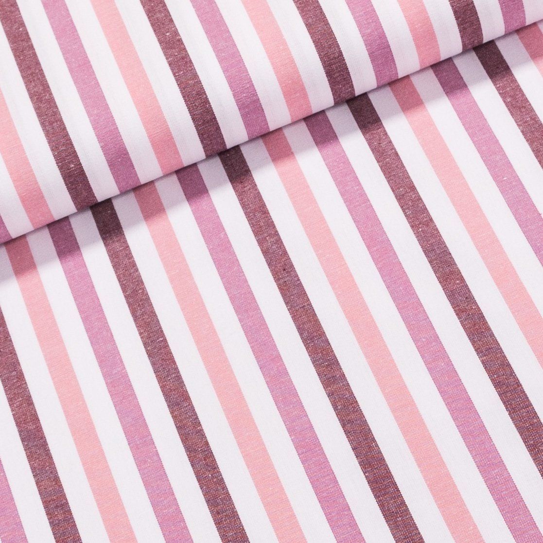 Bavlněný kanafas od českého výrobce proužkovaný, pestře tkaný (1 cm) v růžové barvě. Látka je v šířce 140 cm, vyrobena ze 100% bavlny (gramáž 177g/m2) v plátnové vazbě. Vzor látky je vytkávaný, a je tedy z obou stran stejný.