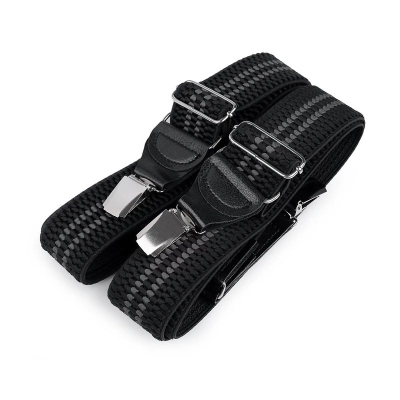 Pánské šle v texturovaném provedení se vzorem pruhů v černé barvě s nastavitelnou délkou 120 cm, šíře 4 cm v provedení ve tvaru písmene "Y" s uchycením na 4 žabky (2 vepředu, 2 vzadu) a zadní vsadkou a doplňky z eko-kůže. Vhodné pro běžné nošení, hipster styl i pro lyžařské a jiné sportovní kalhoty....