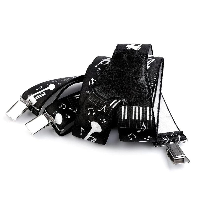 Unisexové šle s hudebním vzorem not a nástrojů v černém provedení jsou určeny pro všechny hudebníky a hudební nadšence nebo jako stylový dárek. Šle jsou s nastavitelnou délkou 120 cm, šíře 4 cm v provedení ve tvaru písmene "Y" s uchycením na žabky a vsadkou z eko kůže.