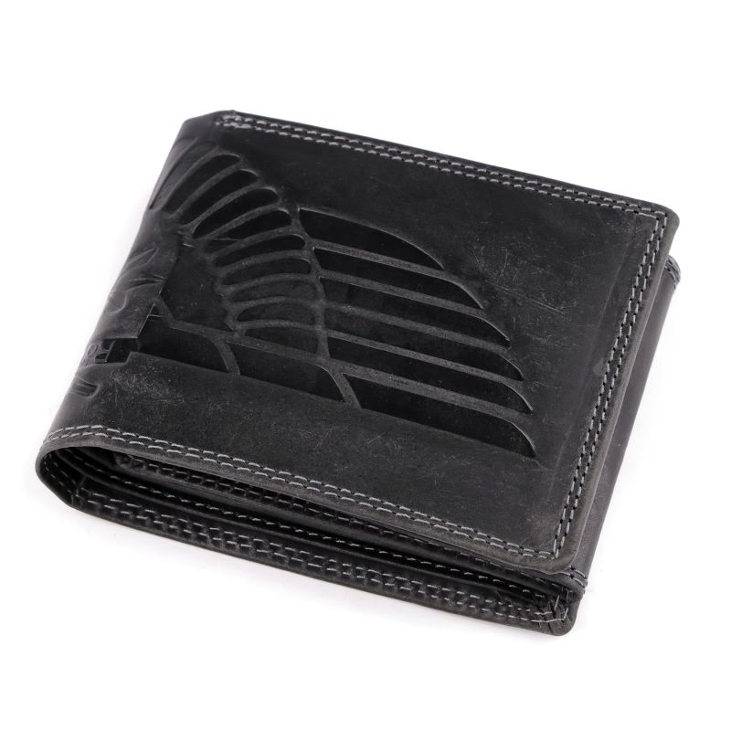 Luxusní pánská peněženka z pravé kůže v černé barvě s vyraženým vzorem křídla s RFID ochranou proti skenování platebních karet. Tato pečlivě ozdobená peněženka pro myslivce a všechny milovníky přírody má také chytrý design - obsahuje 12 přihrádek na karty (z toho 3 průhledné), které lze sepnout na p...
