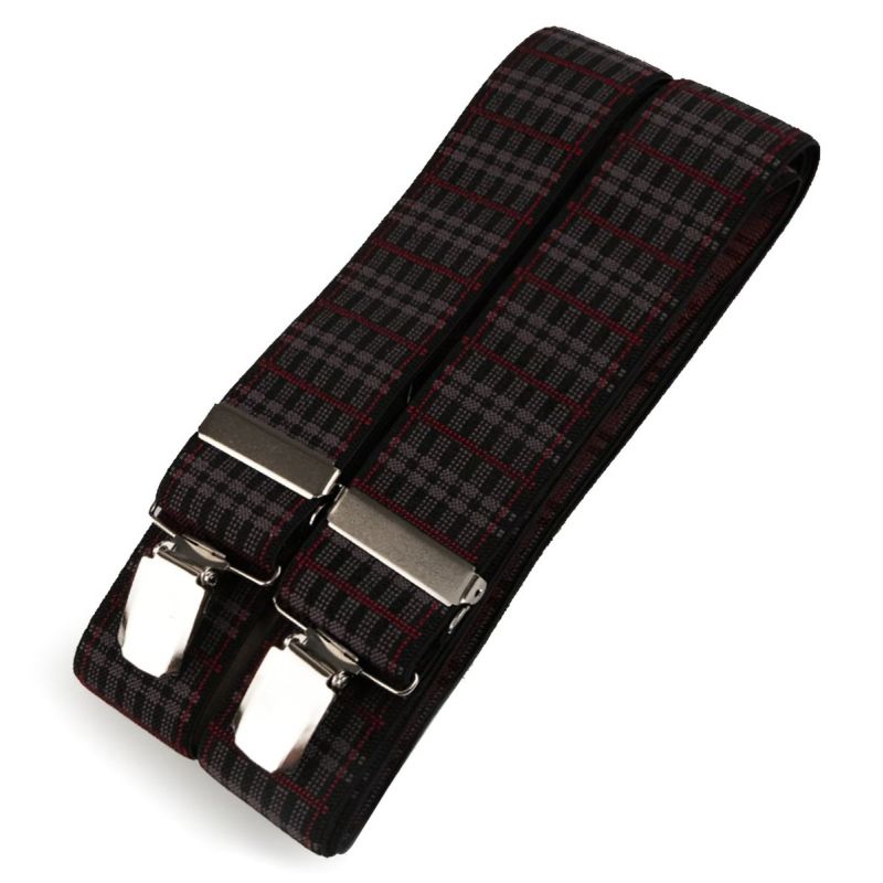 Pánské šle černé s šedým kárem s nastavitelnou délkou 125 cm, šíře 3,5 cm v provedení ve tvaru písmene "X" s uchycením na žabky.