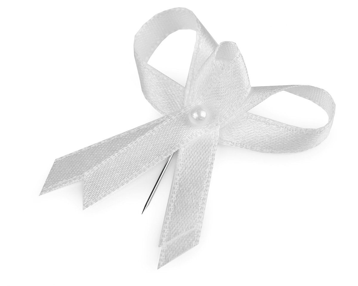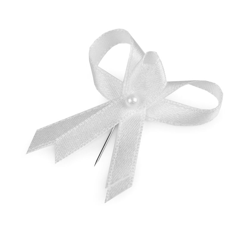 Svatební mašlička – vývazek bílý satén s perličkou a špendlíkem, šířka 35mm (ruční výroba)