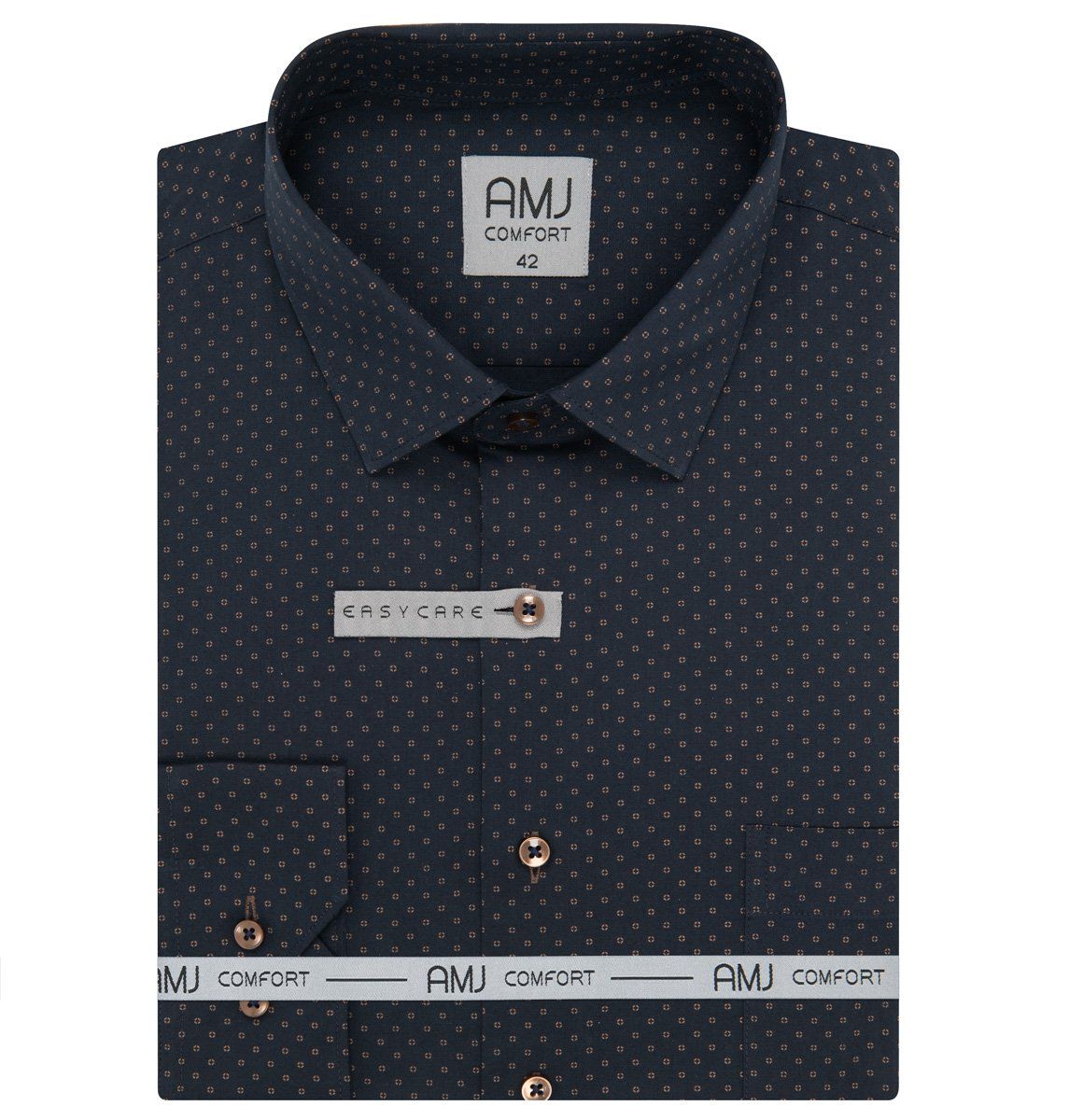Pánská vzorovaná košile AMJ Comfort s dlouhým rukávem. Pánská košile je v černé barvě se vzorem béžových čárkovaných puntíků. Košile se hodí jak do zaměstnání, tak na běžné nošení i do společnosti. V této košili Vám bude velmi příjemně díky použití kvalitního materiálu (95% bavlna, 5% spandex).