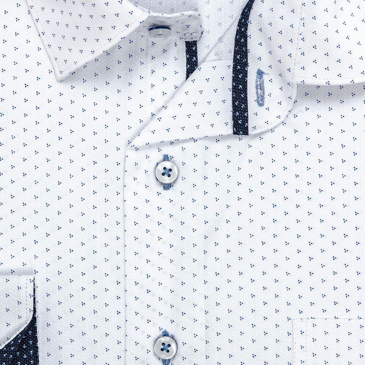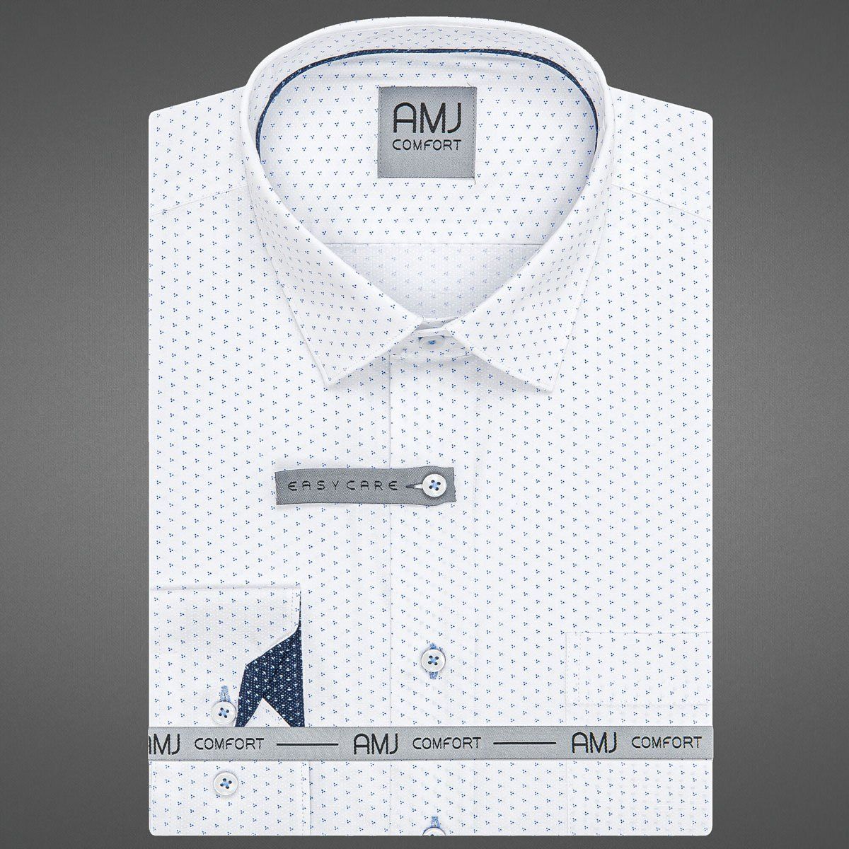 Pánská vzorovaná košile AMJ Comfort s dlouhým rukávem. Pánská košile je v bílé barvě se vzorem drobných modrých tečkovaných trojúhelníčků s modrými doplňky. Košile se hodí jak do zaměstnání, tak na běžné nošení i do společnosti. V této košili Vám bude velmi příjemně díky použití kvalitního materiálu (95% bavlna, 5% spandex).