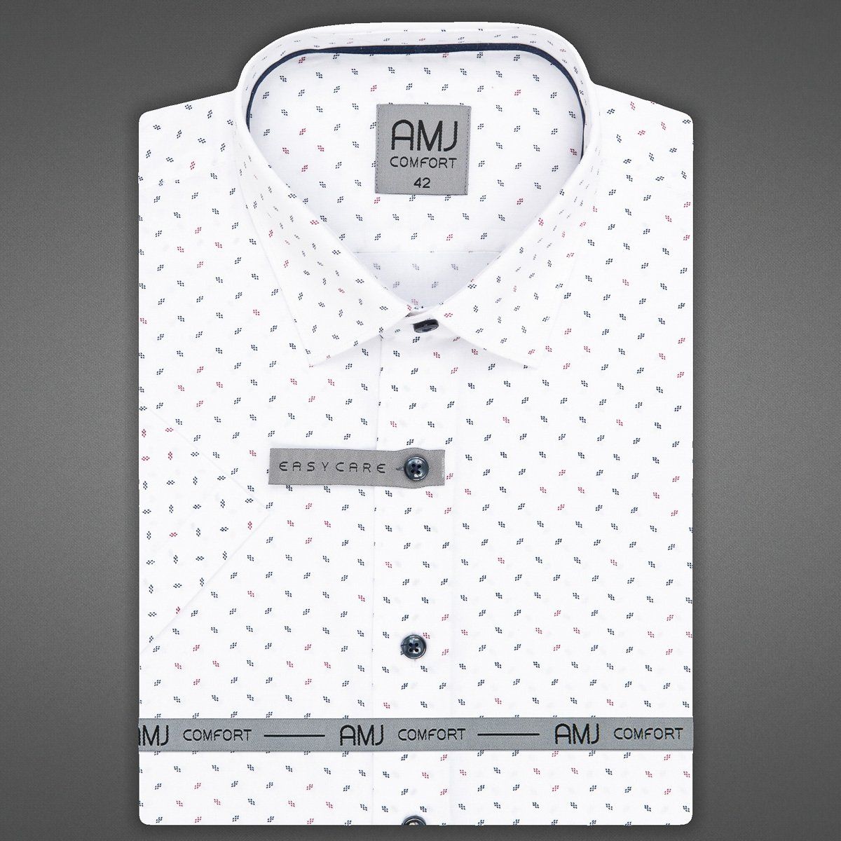 Pánská vzorovaná košile AMJ Comfort s krátkým rukávem. Pánská košile je v bílé barvě se vzorem drobných teček tvořících kvítky s tmavými doplňky. Košile se hodí jak do zaměstnání, tak na běžné nošení i do společnosti. V této košili Vám bude velmi příjemně díky použití kvalitního materiálu (95% bavlny 5% spandex).