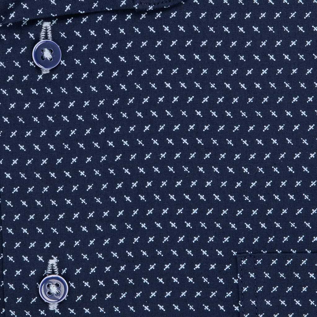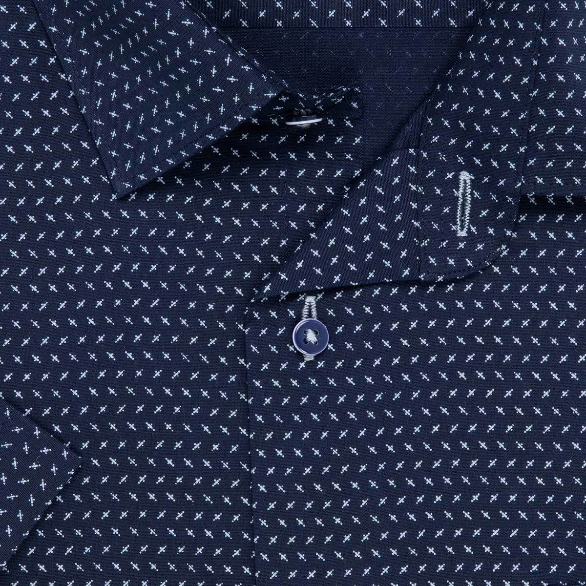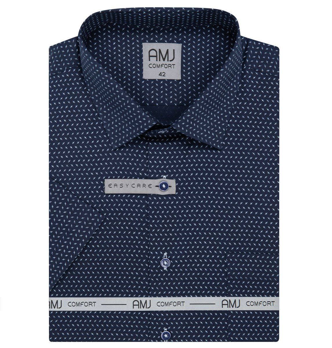Pánská vzorovaná košile AMJ Comfort s krátkým rukávem. Pánská košile je v modré barvě se vzorem bílých čárek a teček tvořící drobné křížky. Košile se hodí jak do zaměstnání, tak na běžné nošení i do společnosti. V této košili Vám bude velmi příjemně díky použití kvalitního materiálu (95% bavlny 5% spandex).