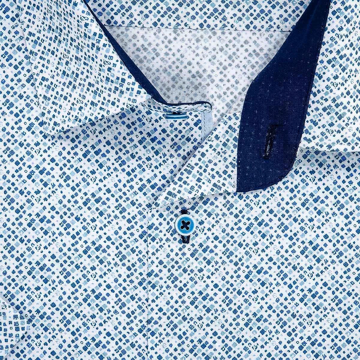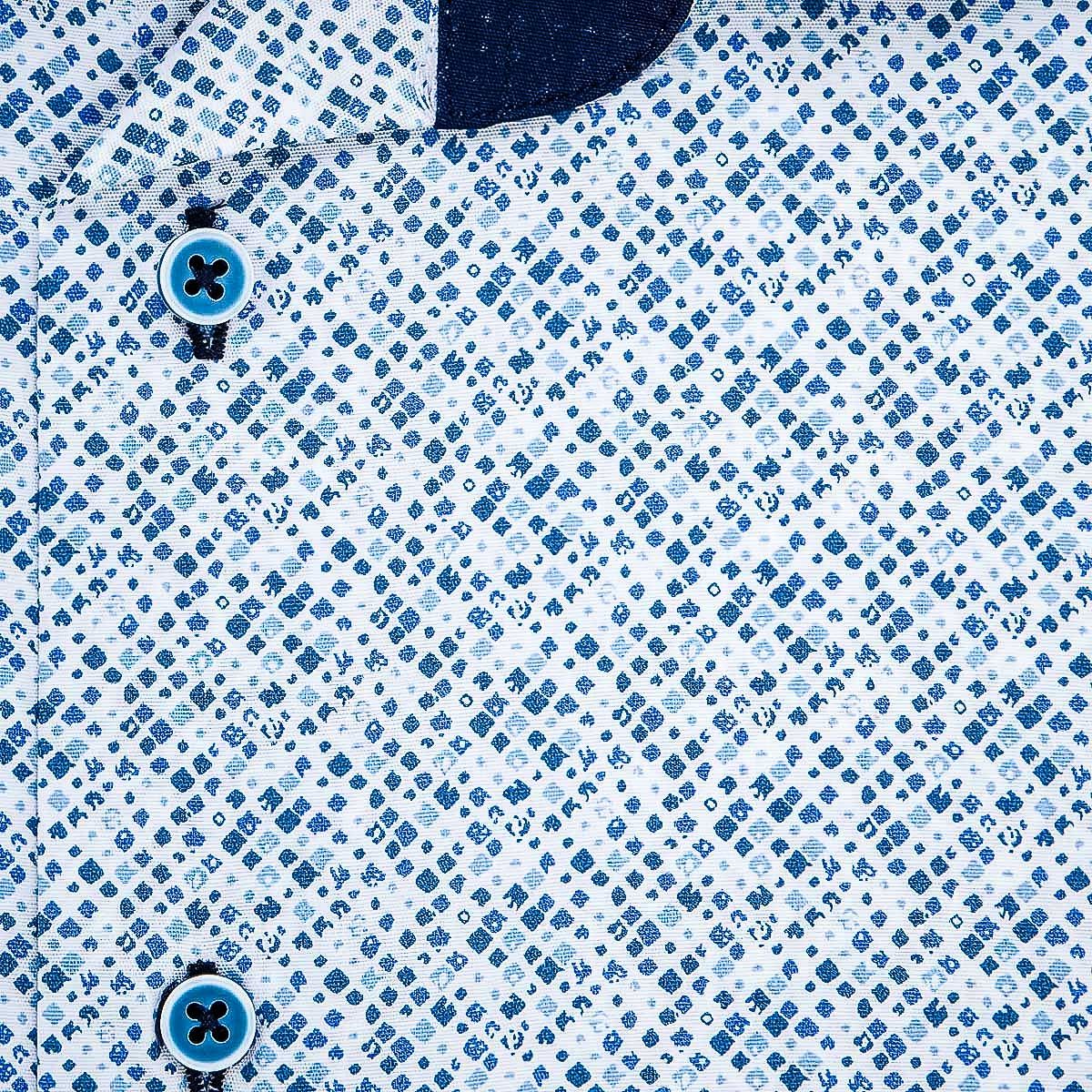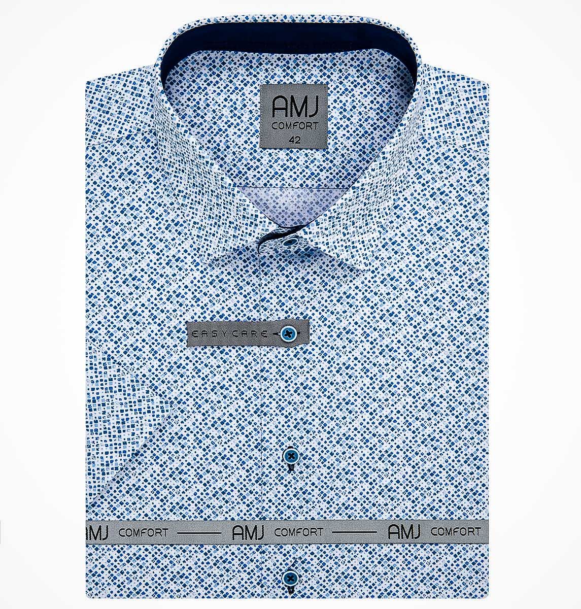Pánská vzorovaná košile AMJ Comfort s krátkým rukávem. Pánská košile je v modro-bílé barvě se vzorem kostek vytvářejících efekt mramoru s tmavě modrými doplňky. Košile se hodí jak do zaměstnání, tak na běžné nošení i do společnosti. V této košili Vám bude velmi příjemně díky použití kvalitního materiálu (95% bavlny 5% spandex).