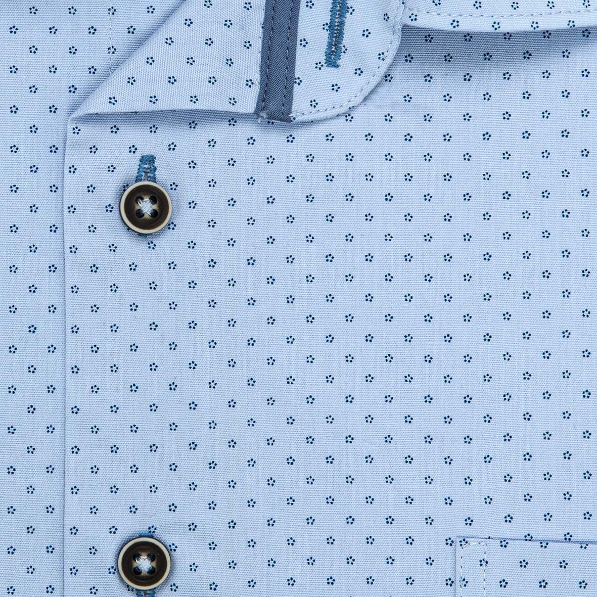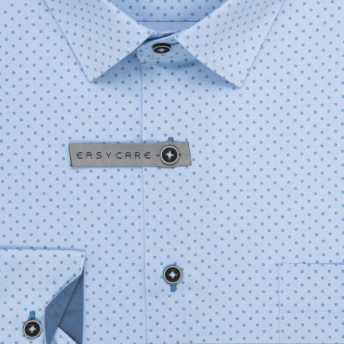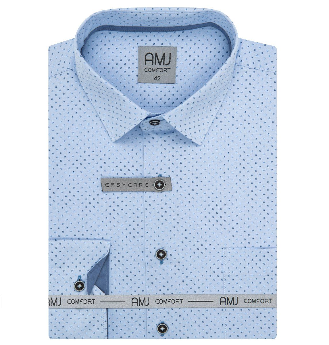 Pánská vzorovaná košile AMJ Comfort s dlouhým rukávem. Pánská košile je ve světle modré barvě se vzorem tmavě modrých tečkovaných pětiúhelníků s modrými doplňky. Košile se hodí jak do zaměstnání, tak na běžné nošení i do společnosti. V této košili Vám bude velmi příjemně díky použití kvalitního materiálu (95% bavlna, 5% spandex).
