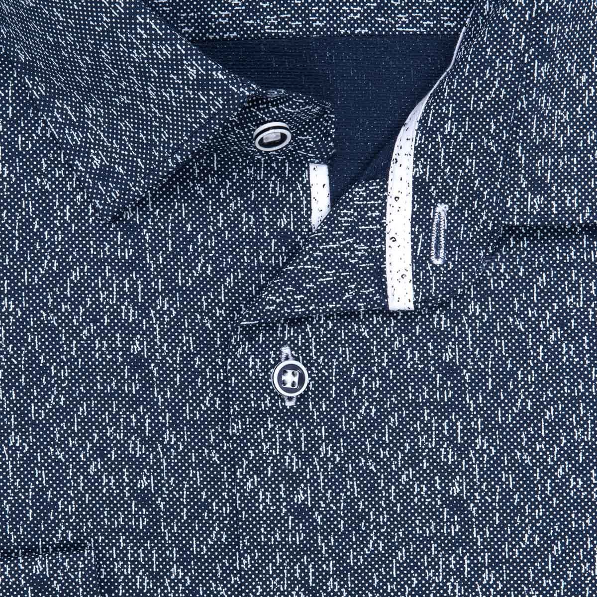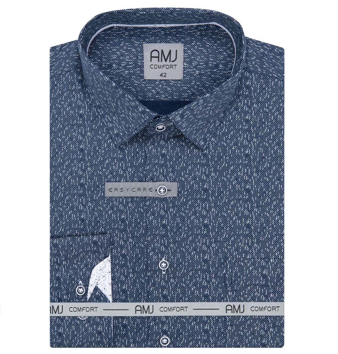 Pánská vzorovaná košile AMJ Comfort s dlouhým rukávem. Pánská košile je v tmavě modré barvě se vzorem prší (bílých čárek a teček) s bílými doplňky. Košile se hodí jak do zaměstnání, tak na běžné nošení i do společnosti. V této košili Vám bude velmi příjemně díky použití kvalitního materiálu (95% bavlna, 5% spandex).