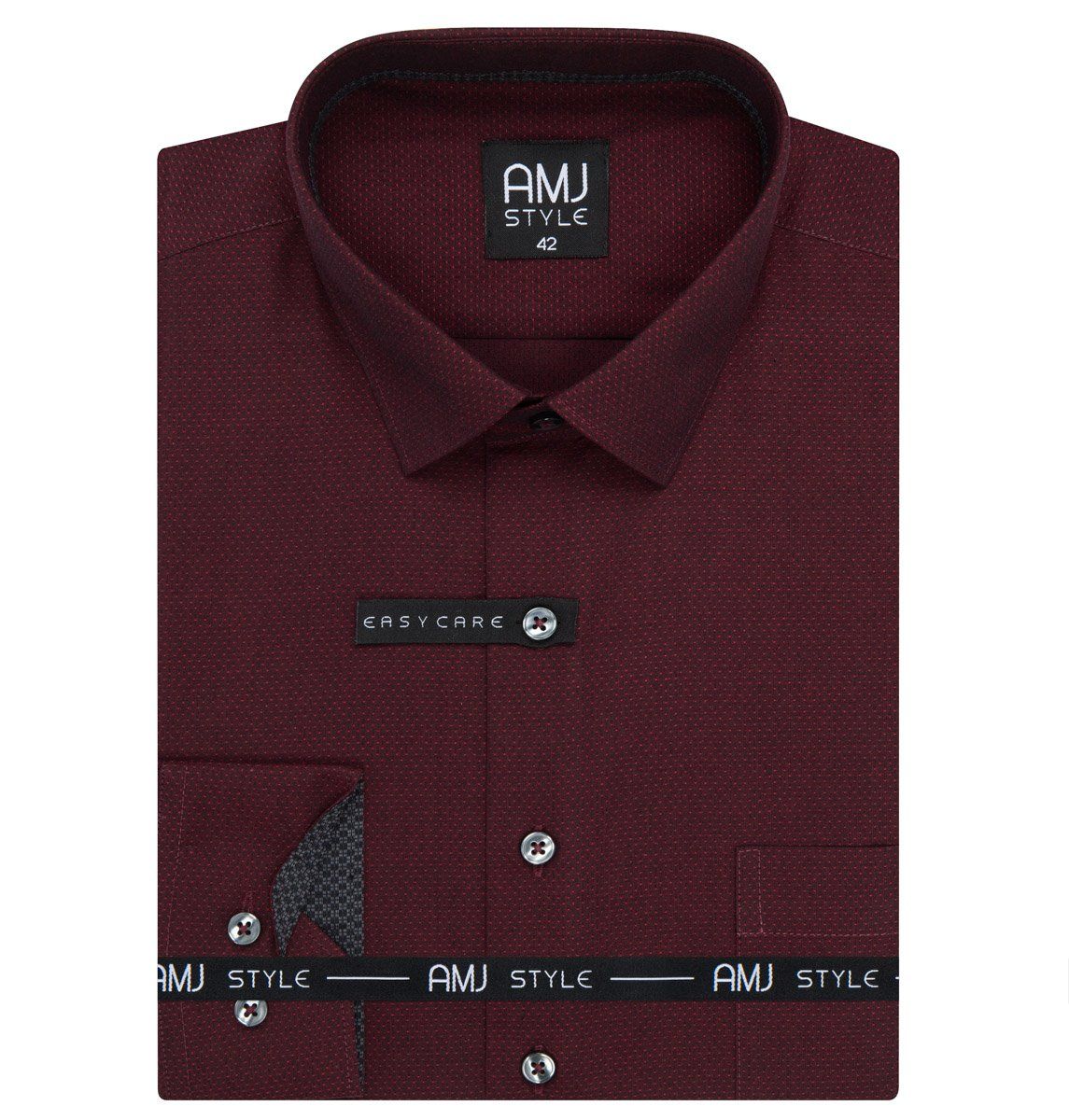 Pánská vzorovaná košile AMJ Style s vytkávaným vzorem s dlouhým rukávem. Pánská košile ve vínové barvě s jemnými světle vínovými puntíky a černými doplňky. Košile je vhodná jak do zaměstnání, tak na běžné nošení i do společnosti. Košile je vyrobena z kvalitního materiálu (60% bavlna a 40% polyester), takže Vám bude v košili velmi příjemně.