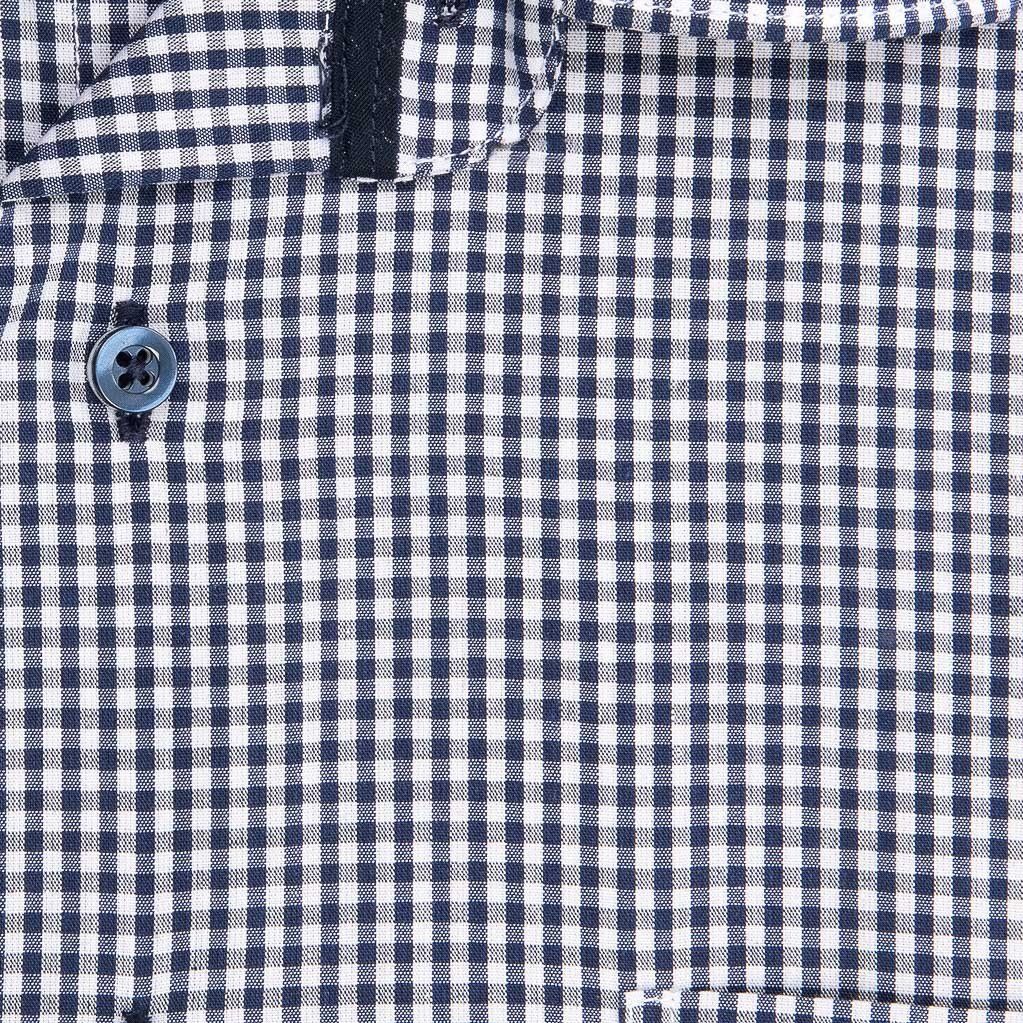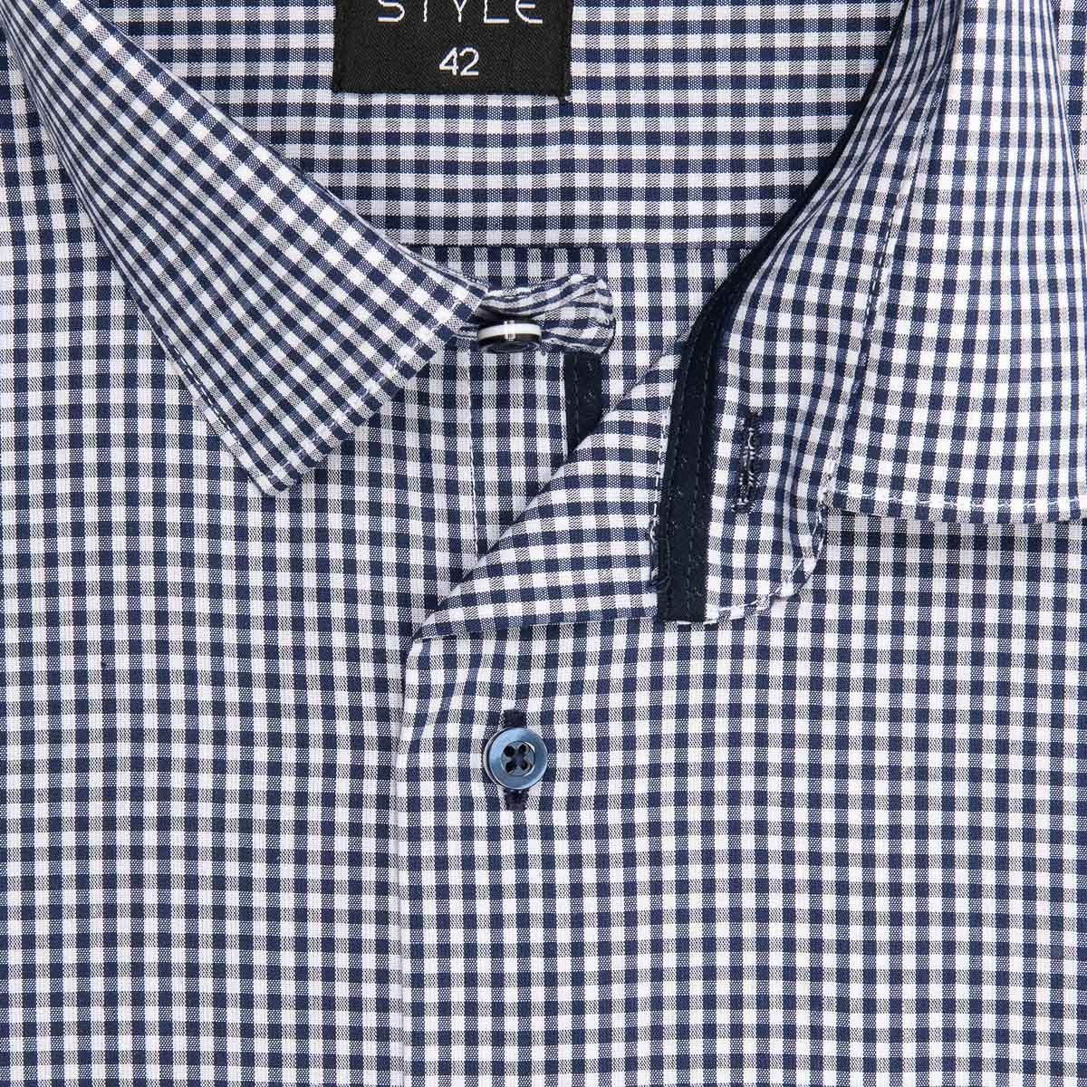 Pánská vzorovaná košile AMJ Style s vytkávaným vzorem s dlouhým rukávem. Pánská košile ve vzoru drobného modro-bílého kára a tmavě modrými doplňky. Ko...