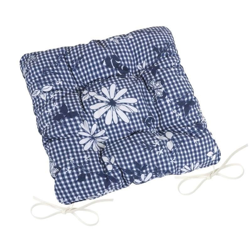 Prošívaný čtvercový sedák s motivem bílého květu na modré kostičce v rozměru 40x40cm s výškou cca 8 cm. Sedák je vyroben z kvalitního materiálu s vysokou odolností proti prosezení a je opatřen provázky pro pevné přichycení k židli. Je vhodný jako dekorační prvek do kuchyně nebo na zahradu pro příjemné sezení. Povlak podsedáku je vyrobený z kombinace 90% bavlny a 10% polyesteru, výplň je tvořena ze 100% polyuretanu (rouno z dutého vlákna).