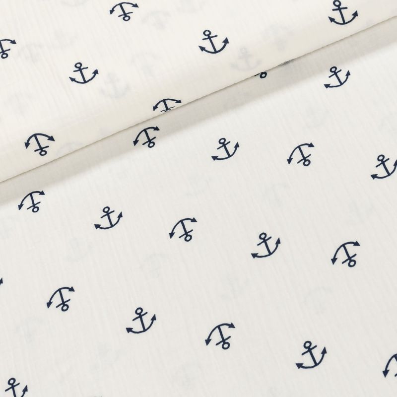 Bavlněná látka (šatovka) mušelín nebo také fáčovina se vzorem kotviček na lehce smetanovém podkladu v krešovaném provedení. Látka je vhodná na výrobu šatů, sukní, halenek, košilí, košilových šatů . Látka je v šířce 135 cm, vyrobena ze 100% bavlny (120g/m). Látka má vzor jen z jedné strany z druhé strany je bez potisku.