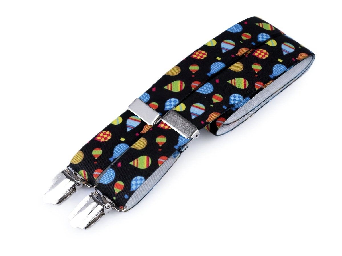 Dětské šle v černé barvě se vzorem barevných balónků s nastavitelnou délkou 70 cm, šíře 2,5cm v provedení ve tvaru písmene "Y" s uchycením na žabky.