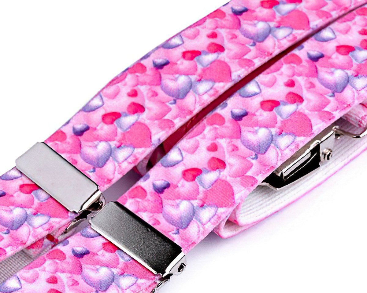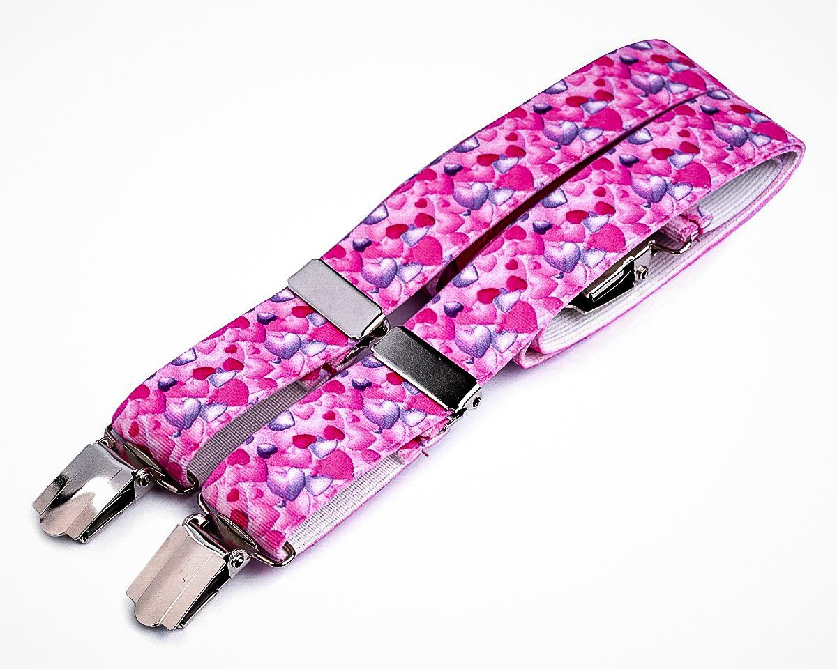 Dětské šle v růžové barvě se vzorem srdíček s nastavitelnou délkou 70 cm, šíře 2,5cm v provedení ve tvaru písmene "Y" s uchycením na žabky.