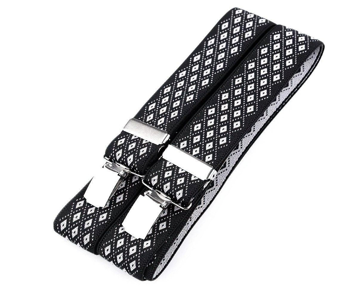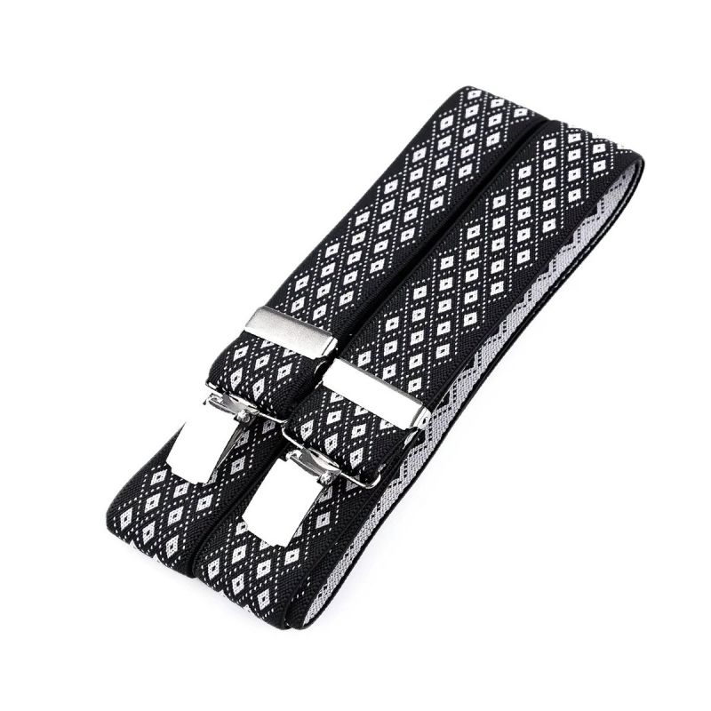 Pánské šle se vzorem černo-bílého drobného kára tvořeného z kosočtverců s nastavitelnou délkou 120 cm, šíře 3,5 cm v provedení ve tvaru písmene "Y" s uchycením na žabky a zadní vsadkou z eko-kůže.