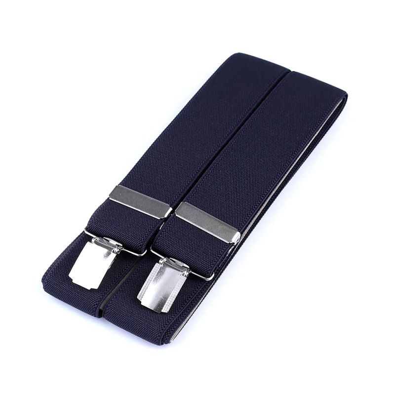 Pánské šle v tmavě modré barvě s nastavitelnou délkou 120 cm, šíře 3,5cm v provedení ve tvaru písmene "Y" s uchycením na žabky a vsadkou z eko kůže.