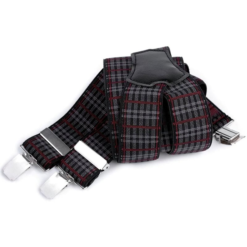 Pánské šle se vzorem drobného vínovo-šedo-černého kára s nastavitelnou délkou 120 cm, šíře 3,5 cm v provedení ve tvaru písmene "Y" s uchycením na žabky a zadní vsadkou z eko-kůže.