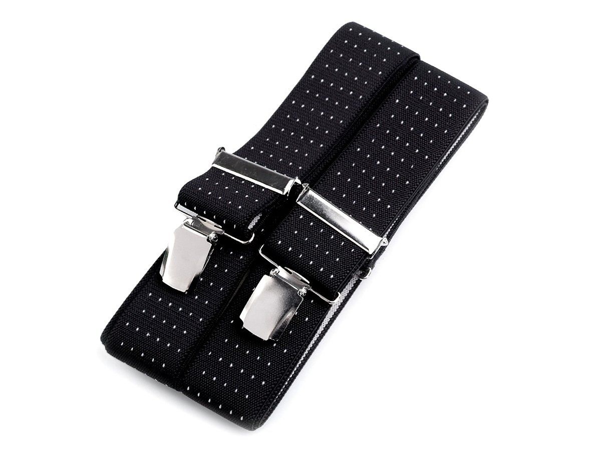 Pánské šle jednobarevné v černé barvě s bílými puntíky s nastavitelnou délkou 125 cm, šíře 3,5 cm v provedení ve tvaru písmene "X" s uchycením na žabky.
