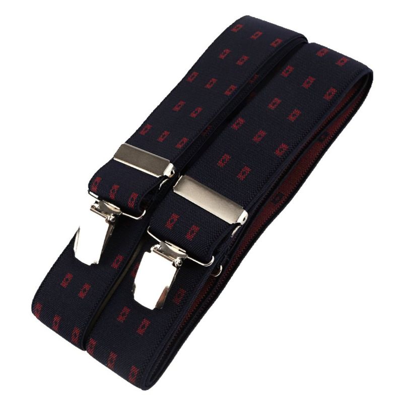 Pánské šle tmavě modré s červenými obdélníčky s nastavitelnou délkou 125 cm, šíře 3,5 cm v provedení ve tvaru písmene "X" s uchycením na žabky.