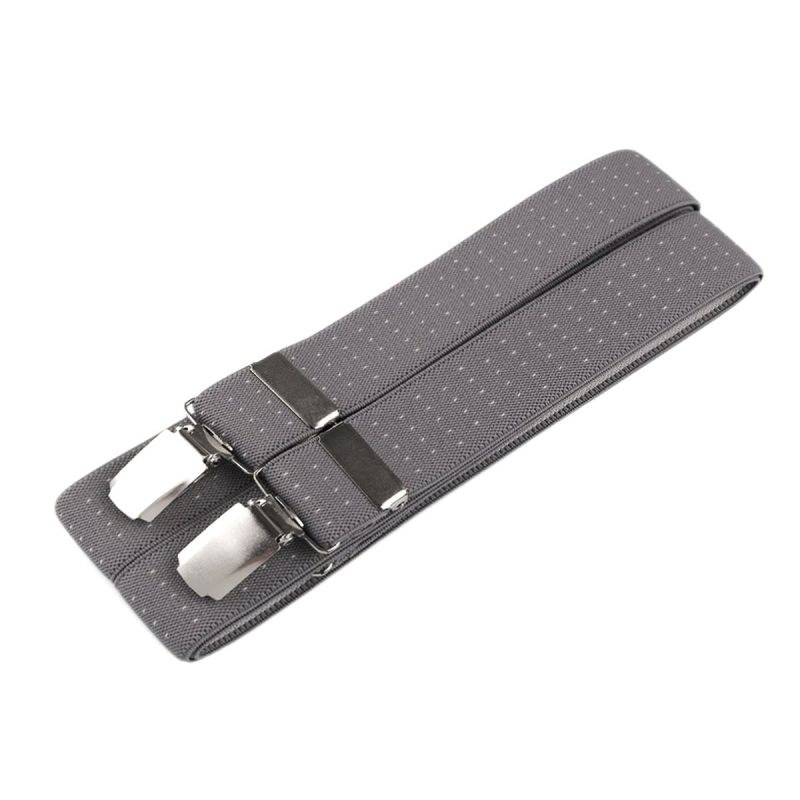 Pánské šle v šedé barvě s bílými tečkami s nastavitelnou délkou 125 cm, šíře 3 cm v provedení ve tvaru písmene "X" s uchycením na žabky.