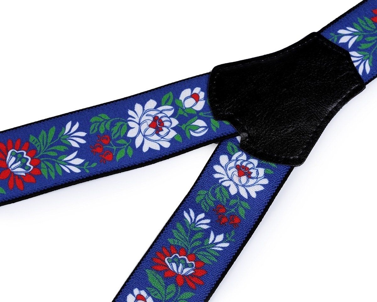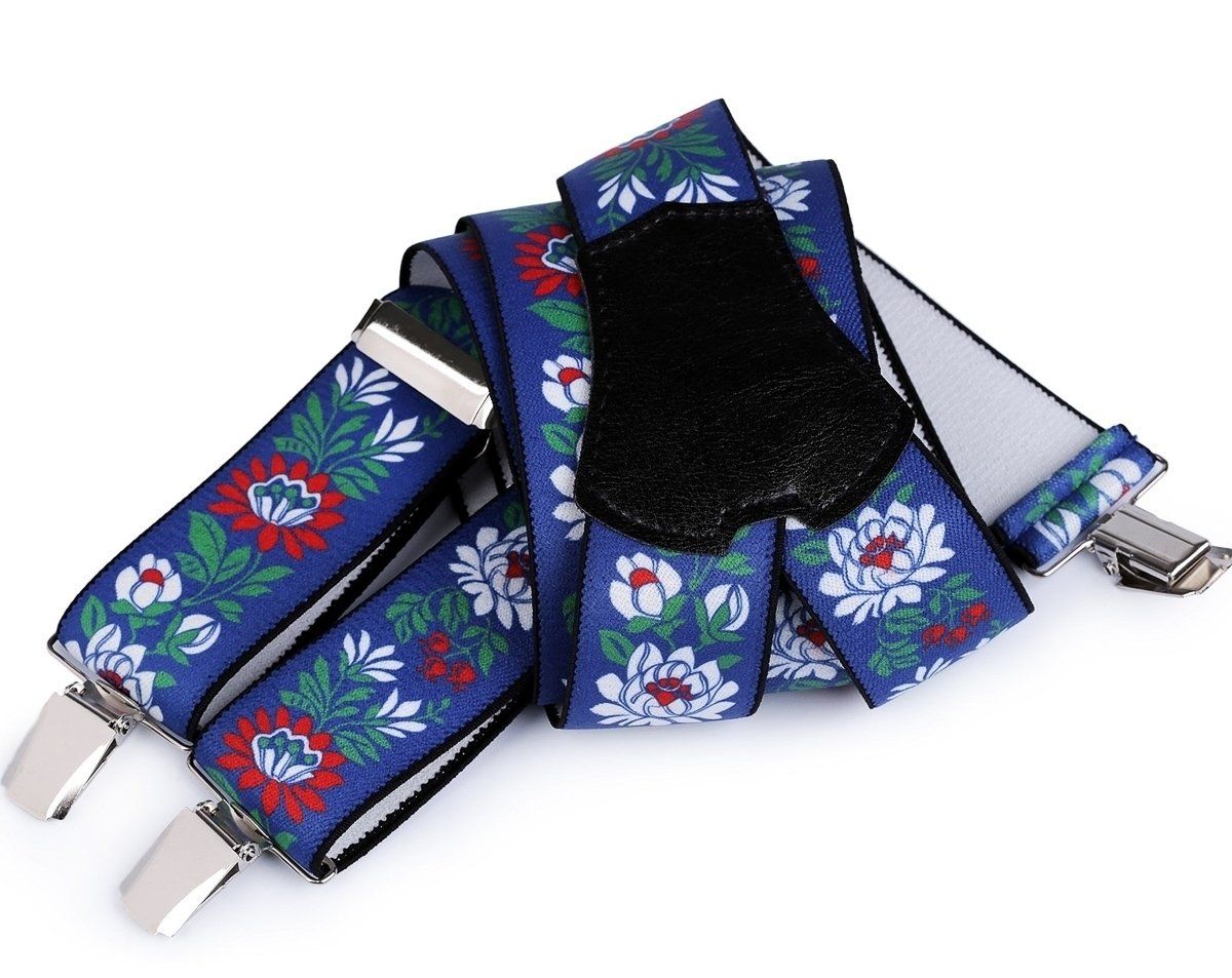 Pánské šle s folklorním květinovým vzorem v modré barvě jsou určeny pro všechny stylové folklorní akce, hudebníky nebo jako stylový dárek. Šle jsou s nastavitelnou délkou 120 cm, šíře 4 cm v provedení ve tvaru písmene "Y" s uchycením na žabky.