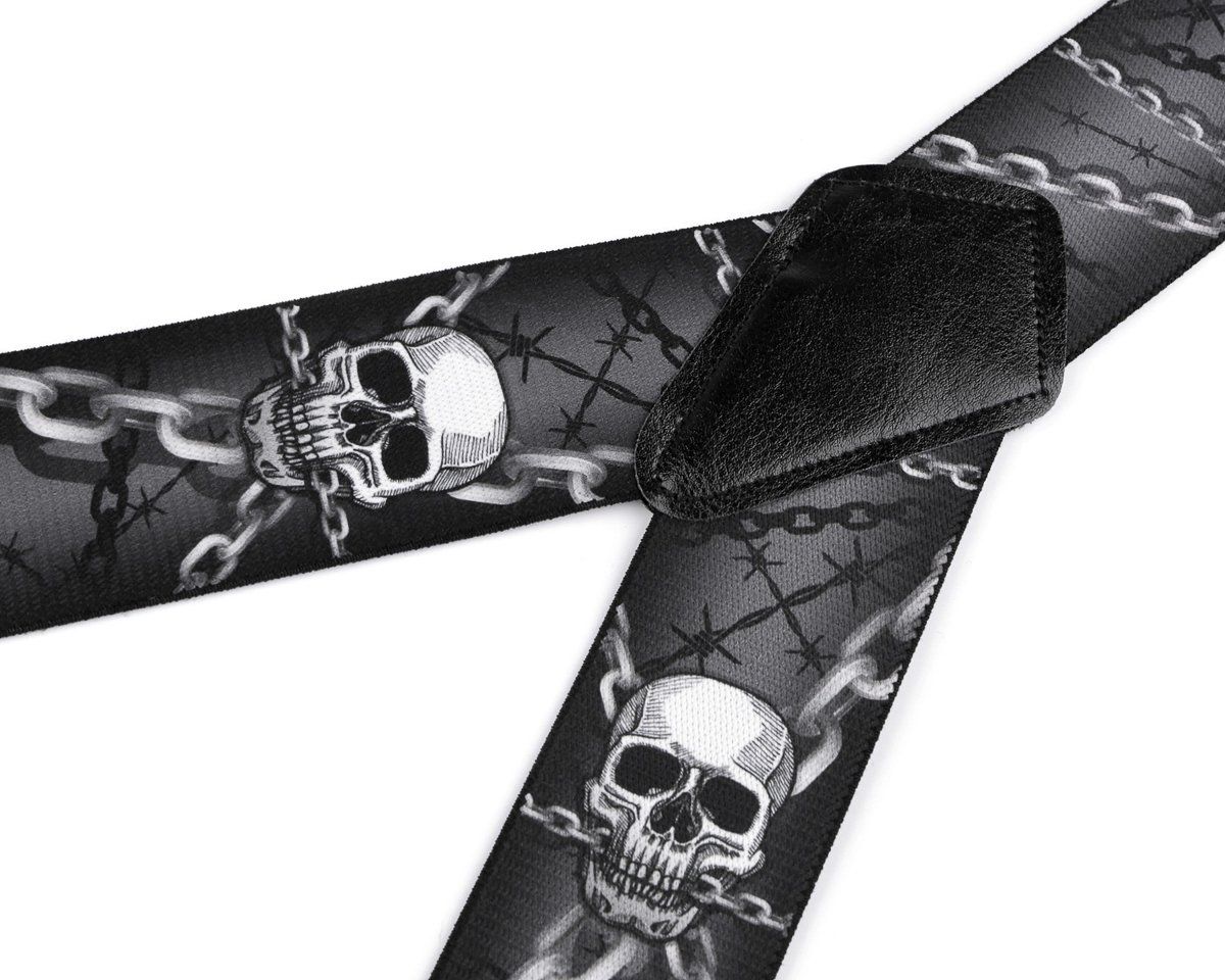 Pánské šle s motorkářským vzorem lebek v šedo-černé barvě jsou určeny pro všechny motorkáře a nebo jako stylový dárek. Šle jsou s nastavitelnou délkou 120 cm, šíře 5 cm v provedení ve tvaru písmene "Y" s uchycením na žabky.