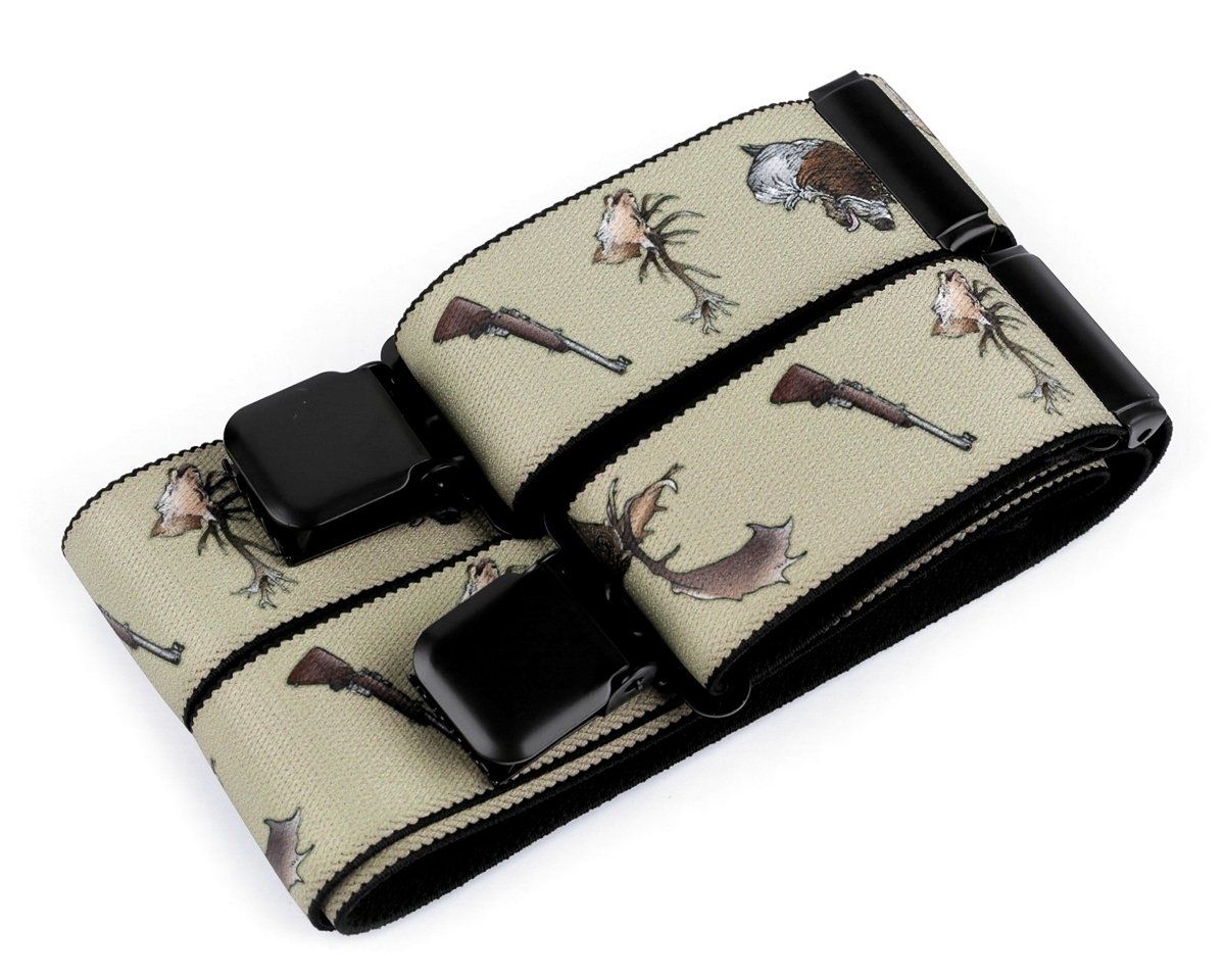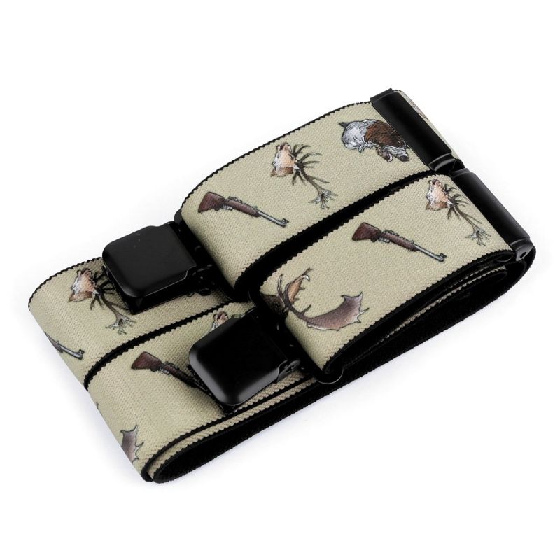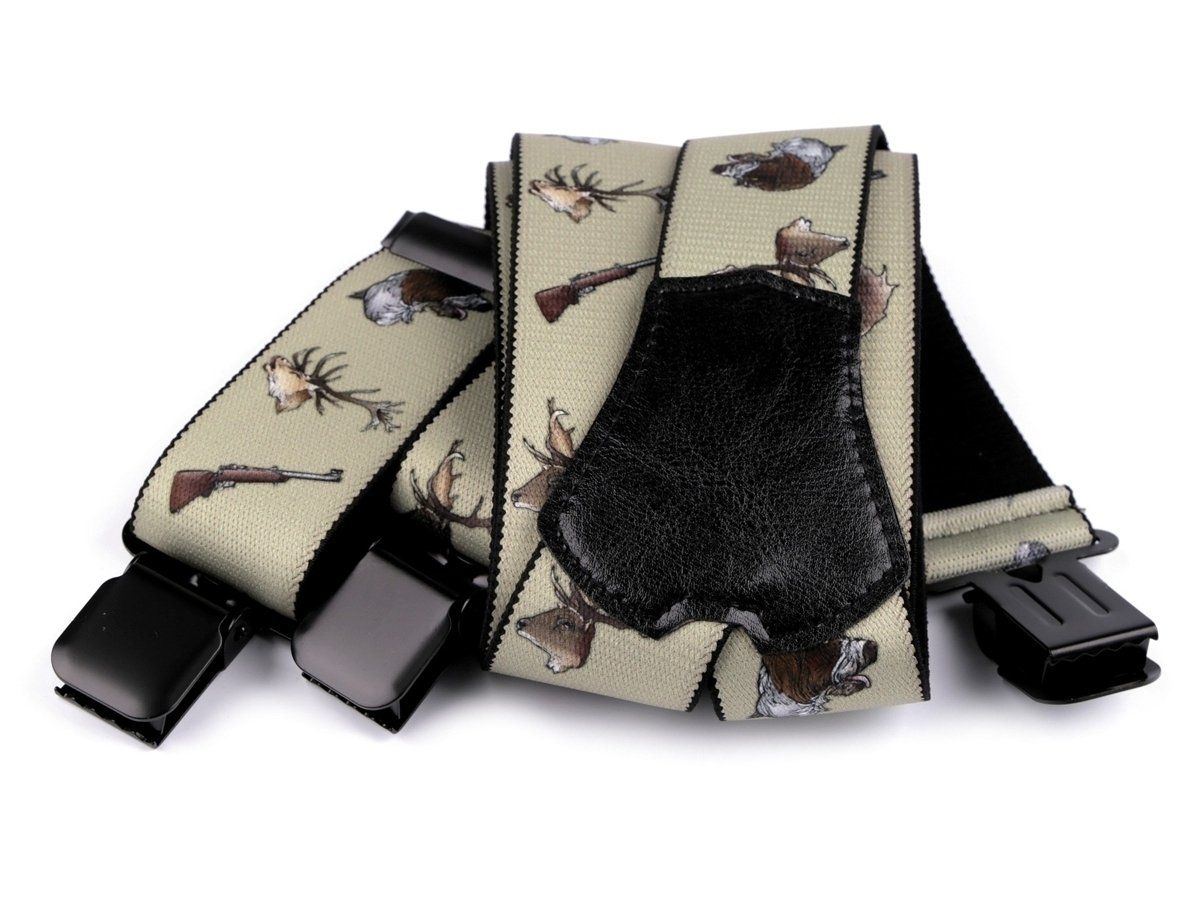 Pánské šle s mysliveckým vzorem pušek a jelenů v béžovo-zelené barvě jsou určeny pro všechny příznivce myslivosti, lesnictví nebo jako stylový dárek. Šle jsou s nastavitelnou délkou 120 cm, šíře 4 cm v provedení ve tvaru písmene "Y" s uchycením na žabky.