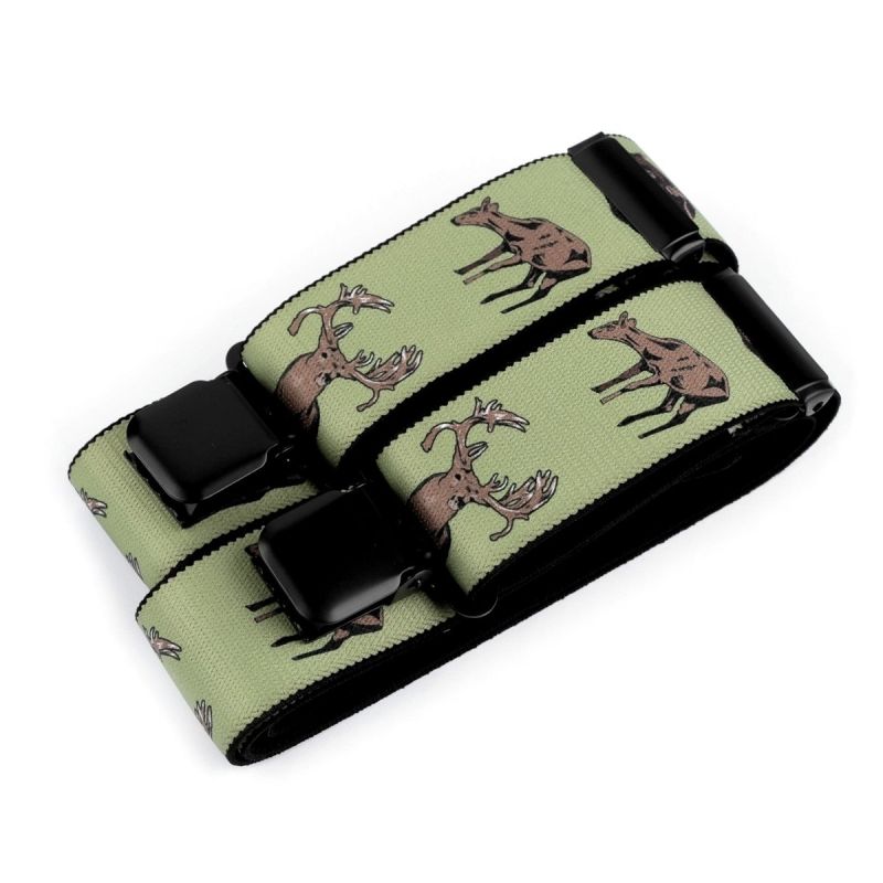 Pánské šle s mysliveckým vzorem zvěře v světle zelené barvě jsou určeny pro všechny příznivce myslivosti, lesnictví nebo jako stylový dárek. Šle jsou s nastavitelnou délkou 120 cm, šíře 4 cm v provedení ve tvaru písmene "Y" s uchycením na žabky.