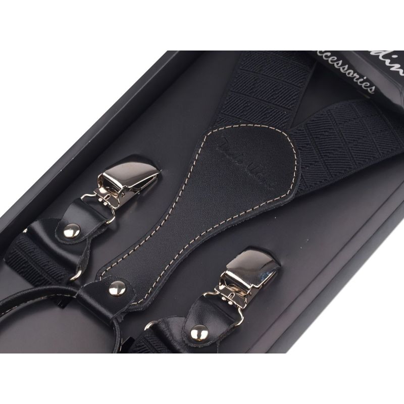 Klasické pánské šle (kšandy) s černými čtverci české výroby z kolekce Paolo Udini zajistí vyšší pocit pohodlí i většího luxusu. Vyrobeny jsou v kombinaci polyesteru a elastanu a spojení popruhů je z pravé kůže. Provedení je ve tvaru „Y“ a upevňují se ke kalhotám pomocí kovových žabek. Šířka popruhů činí 3,5cm a délka 110cm. Díky její nastavitelnosti lze tyto šle použít pro výšku postavy od 165cm do 185cm. Využití najdou jak pro běžné nošení přes košili, tak i k obleku. Jsou výborným funkčním pomocníkem i moderním módním doplňkem. Balené jsou v efektní krabičce, můžete je proto využít i jako dárek pro své blízké.