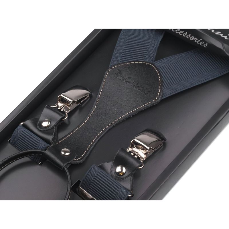 Pánské šle (kšandy) s tmavě modrými pruhy s koženými prvky s nastavitelnou délkou až 110 cm, šíře 3,5cm v provedení ve tvaru písmene "Y" s uchycením na žabky.