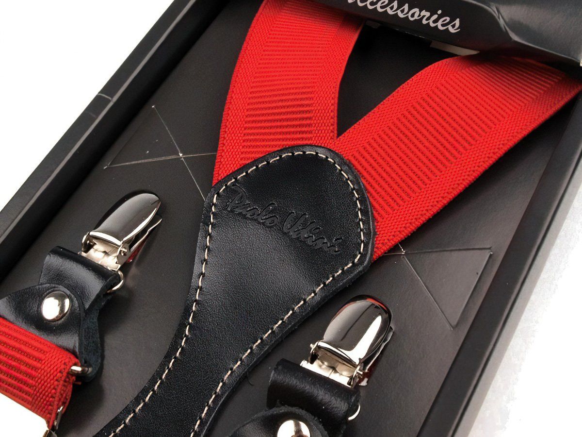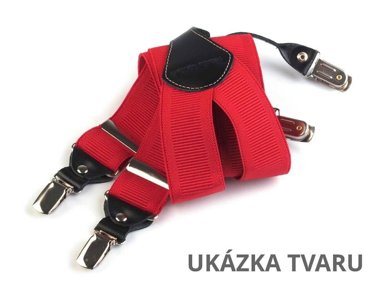Pánské šle (kšandy) červené s koženými prvky s nastavitelnou délkou až 110 cm, šíře 3,5cm v provedení ve tvaru písmene "Y" s uchycením na žabky.