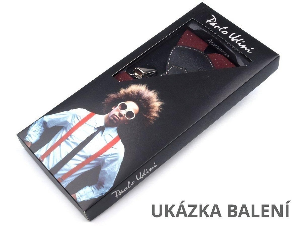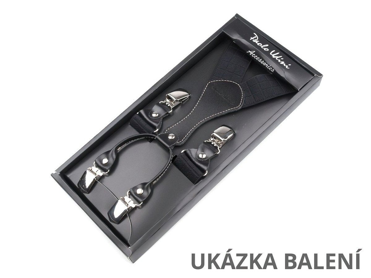 Klasické pánské šle (kšandy) s černými čtverci české výroby z kolekce Paolo Udini zajistí vyšší pocit pohodlí i většího luxusu. Vyrobeny jsou v kombinaci polyesteru a elastanu a spojení popruhů je z pravé kůže. Provedení je ve tvaru „Y“ a upevňují se ke kalhotám pomocí kovových žabek. Šířka popruhů činí 3,5cm a délka 110cm. Díky její nastavitelnosti lze tyto šle použít pro výšku postavy od 165cm do 185cm. Využití najdou jak pro běžné nošení přes košili, tak i k obleku. Jsou výborným funkčním pomocníkem i moderním módním doplňkem. Balené jsou v efektní krabičce, můžete je proto využít i jako dárek pro své blízké.