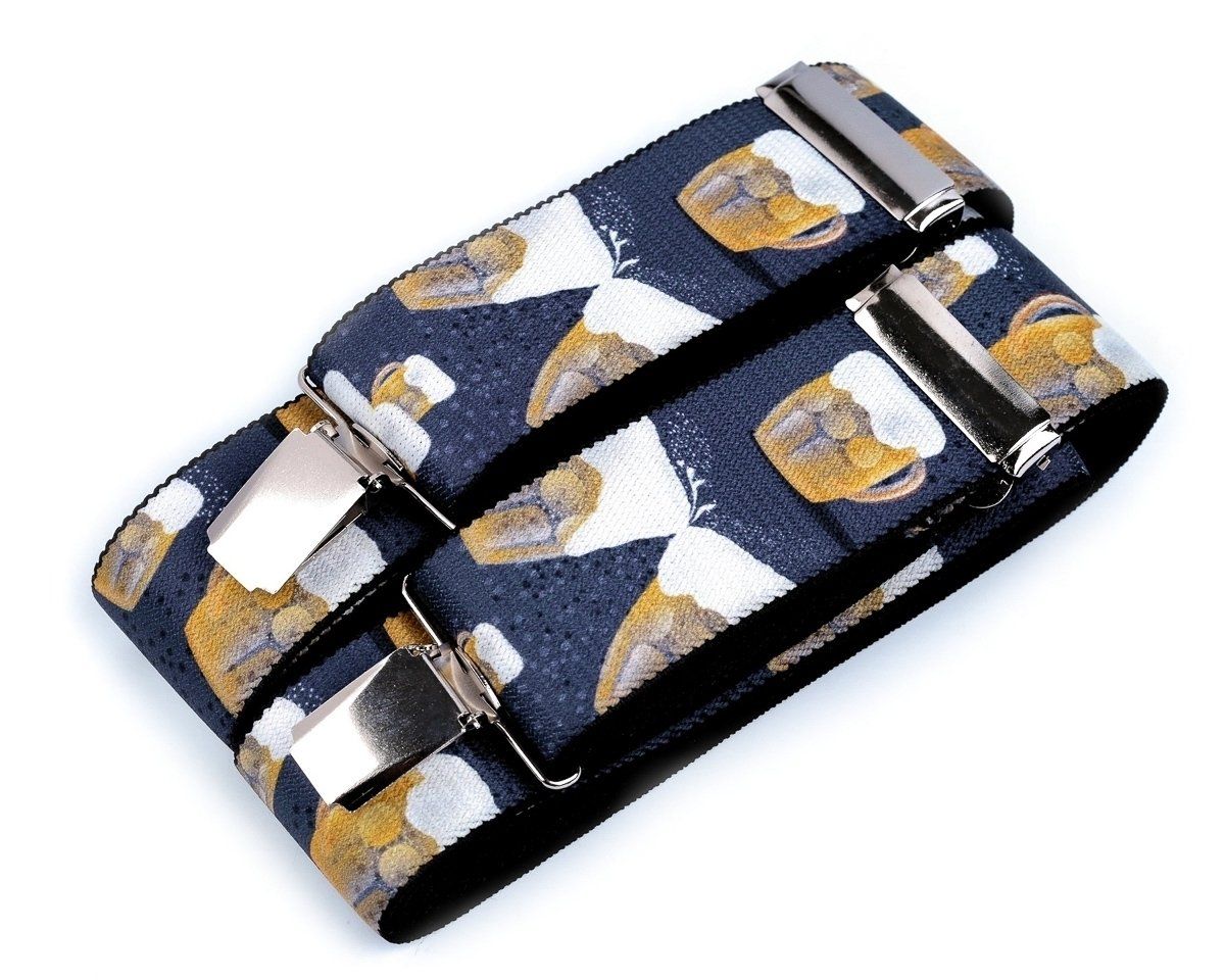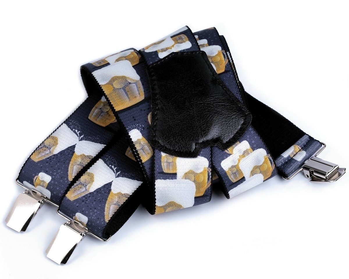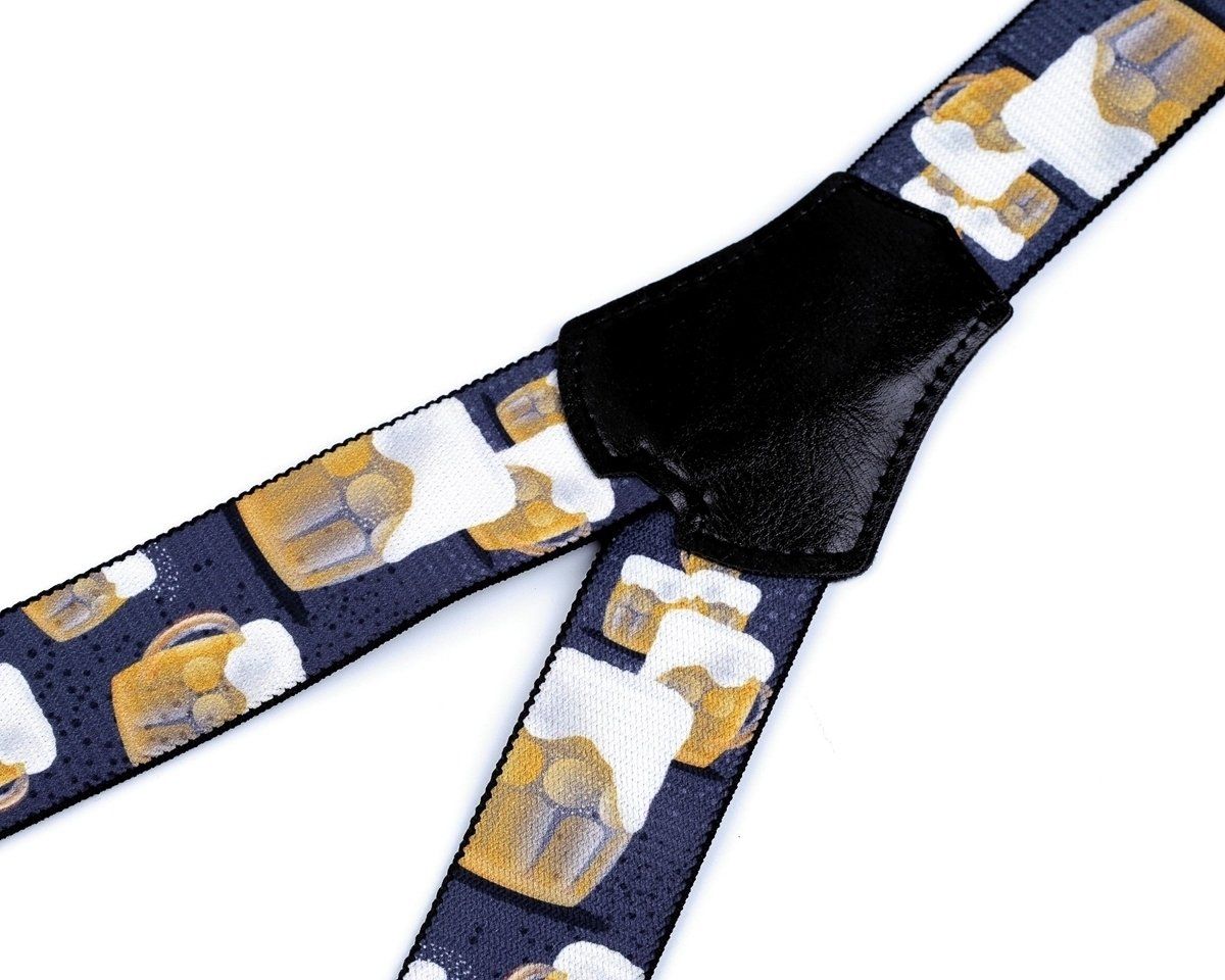 Pánské šle s pivním vzorem půllitrů piva v modré jeans barvě jsou určeny pro všechny pivaře a příznivce zlatavého moku nebo jako stylový dárek. Šle jsou s nastavitelnou délkou 120 cm, šíře 4 cm v provedení ve tvaru písmene "Y" s uchycením na žabky.