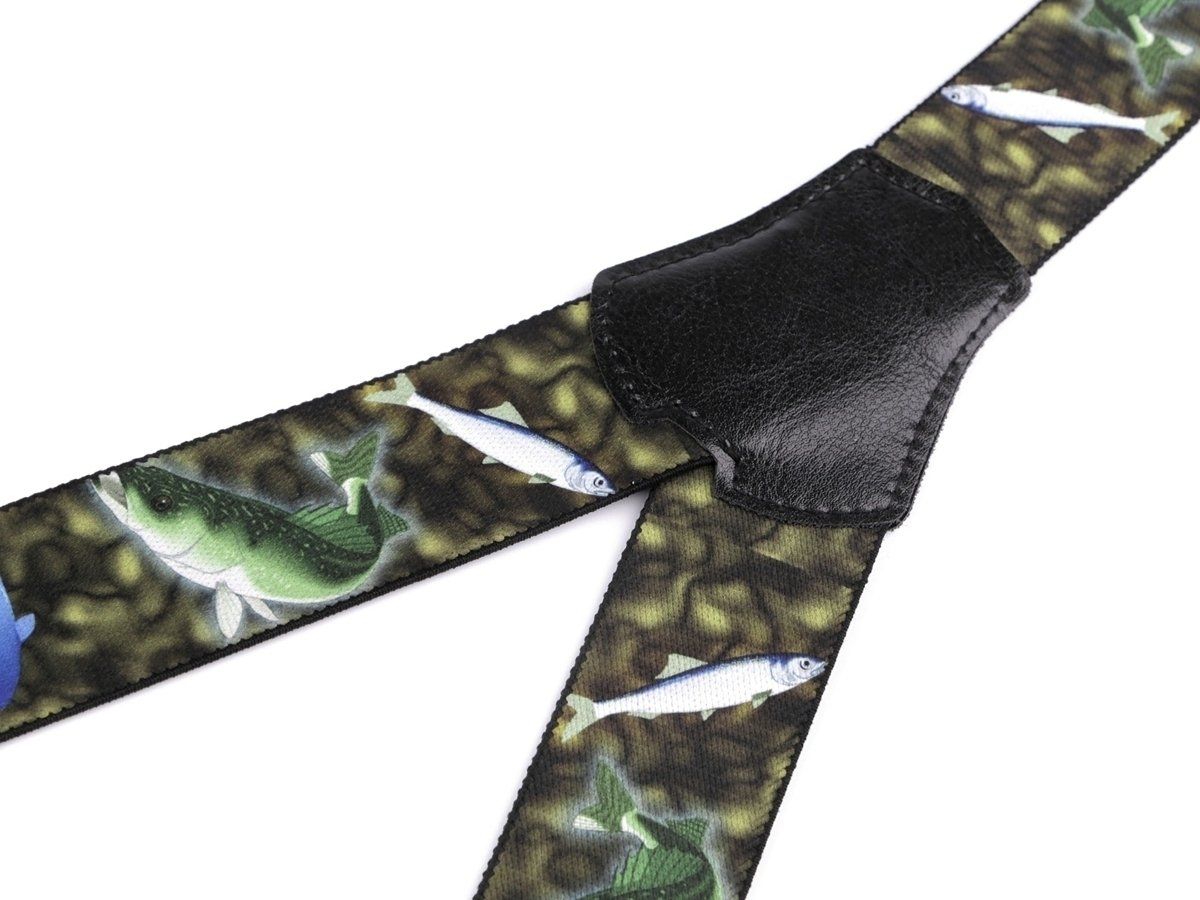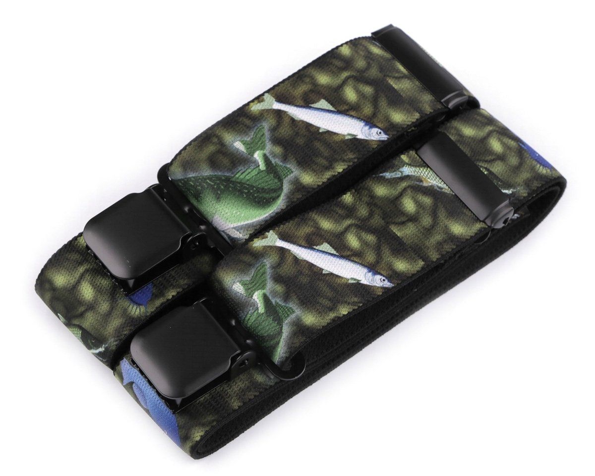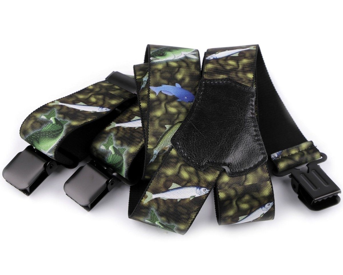 Pánské šle s rybářským vzorem ryb a štik v khaki zelené maskáčové barvě jsou určeny pro všechny rybáře a příznivce rybářství nebo jako stylový dárek. Šle jsou s nastavitelnou délkou 120 cm, šíře 4 cm v provedení ve tvaru písmene "Y" s uchycením na žabky.