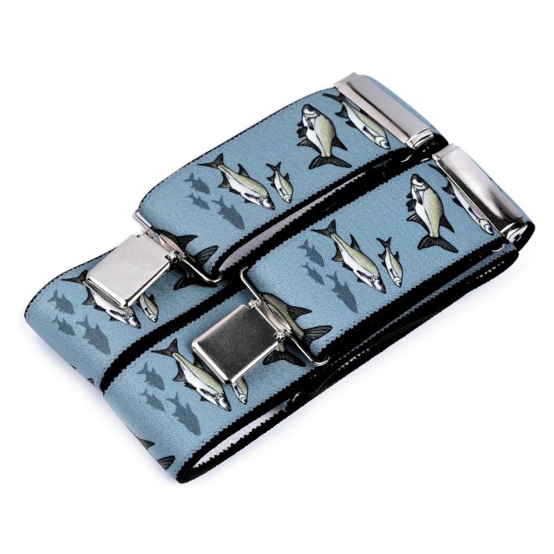 Pánské šle s rybářským vzorem ryb v světle šedo-modré barvě jsou určeny pro všechny rybáře a příznivce rybářství nebo jako stylový dárek. Šle jsou s nastavitelnou délkou 120 cm, šíře 4 cm v provedení ve tvaru písmene "Y" s uchycením na žabky.